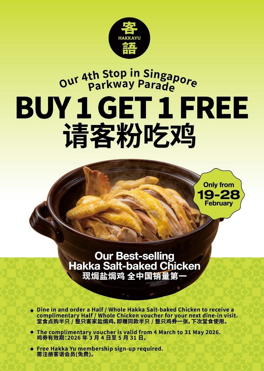 In summary, the Hakka Yu Buy 1 Get 1 Free Hakka Salt-Baked Chicken promotion is more than just a simple offer. It’s a celebration of their new Parkway Parade outlet, a chance to enjoy a signature dish, and an opportunity to be rewarded for dining. With generous portion sizes, authentic flavour, and a welcoming environment, this deal is ideal for families, friends, and anyone looking to indulge in delicious Hakka cuisine. By signing up for the complimentary membership, diners not only enjoy immediate benefits but also position themselves for future rewards, making each visit even more worthwhile.
