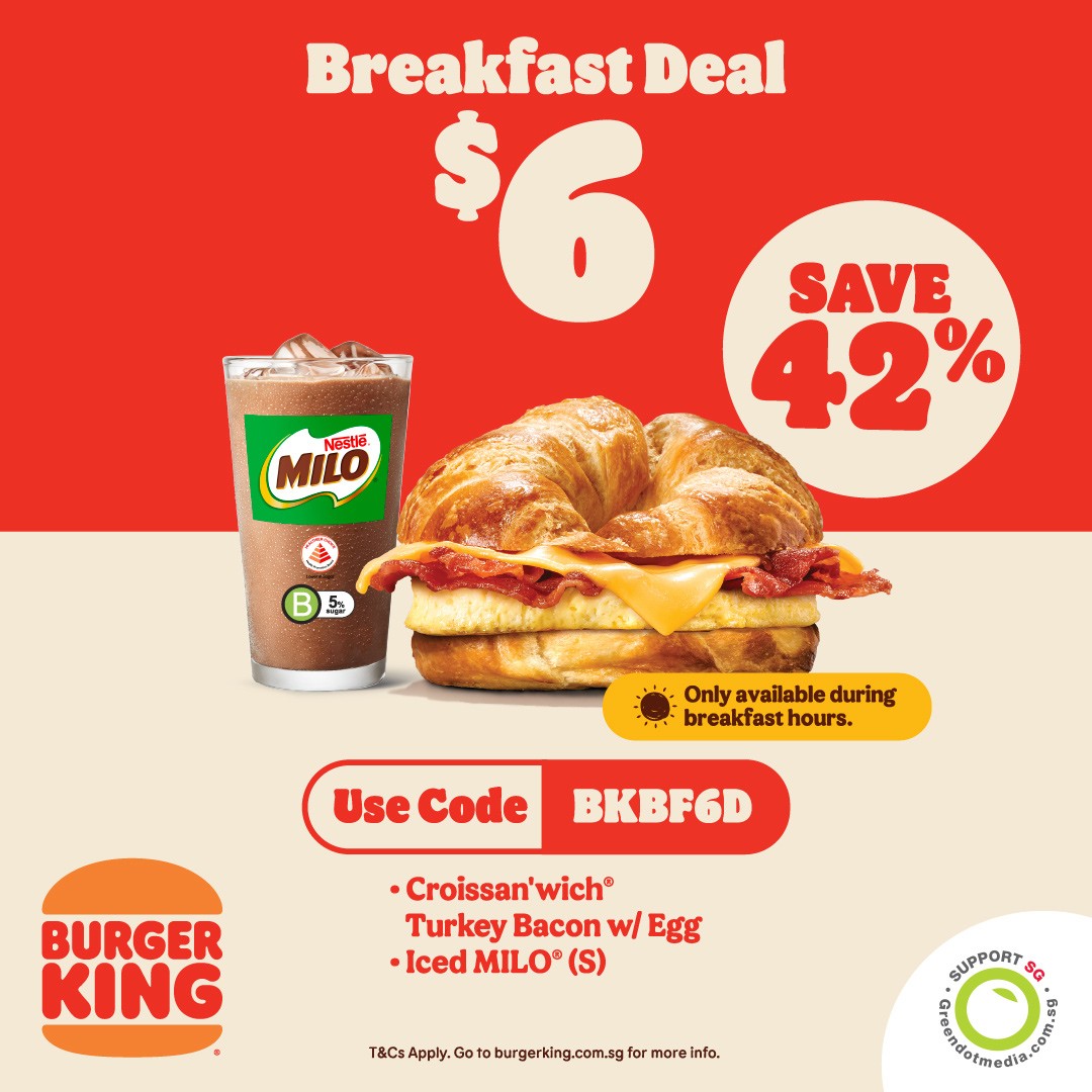 In conclusion, the $6 Breakfast Deal is a must-try for anyone who appreciates a hearty and well-priced breakfast. With its combination of a Turkey Bacon with Egg Croissan’wich and a small Iced Milo, it delivers both flavour and value. The ease of redemption using the code BKBF6D, the limitation to breakfast hours ensuring freshness, and the generous savings make it a promotion that’s hard to resist. Don’t miss the chance to fuel your mornings with this affordable, delicious, and satisfying breakfast offer from Burger King Singapore.