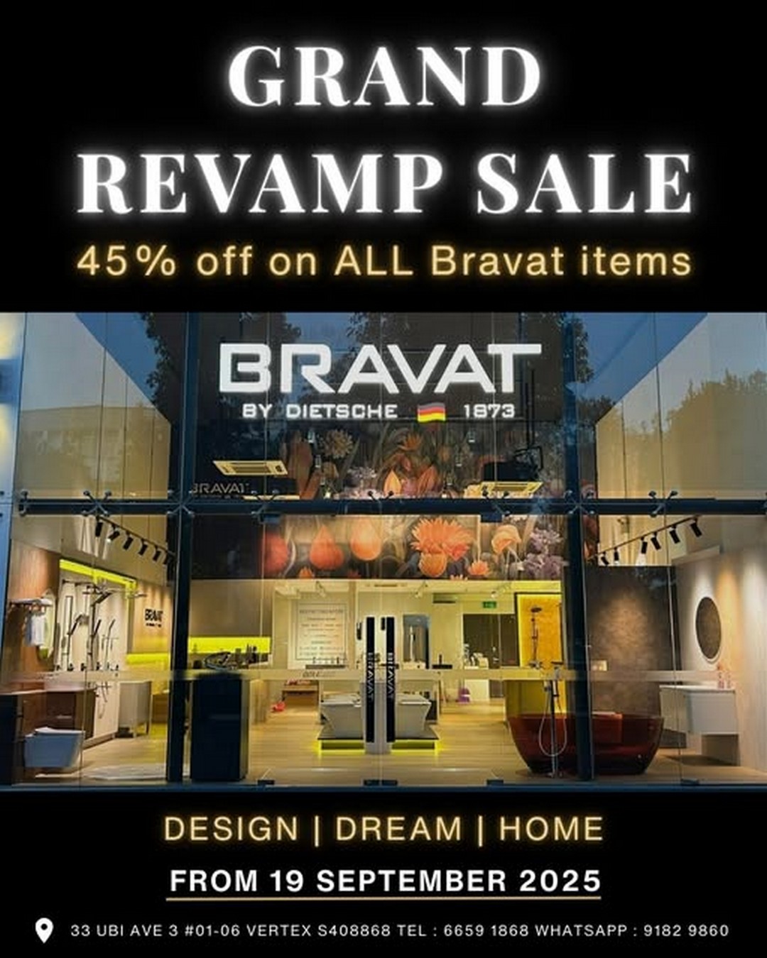 In summary, the Grand Revamp Sale at BRAVAT Singapore represents a rare opportunity for anyone looking to upgrade their bathroom or explore premium fittings at unbeatable prices. With 45% off all items, a beautifully redesigned showroom, and expert staff on hand, it’s the perfect occasion to explore, shop, and get inspired. Mark 19 September 2025 on their calendar and plan a visit soon—their dream bathroom could be just a shopping trip away.