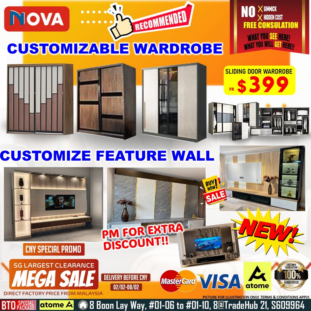 Another important highlight of this event is customisation. Many homeowners struggle to find furniture that fits perfectly into their space, especially in Singapore where apartment layouts vary widely. Nova Furnishing Tradehub21 offers customisable wardrobes and designer feature walls, giving buyers the flexibility to choose options that suit their storage needs and interior style. Customised wardrobes starting from $399 make it possible to maximise space without stretching the renovation budget.