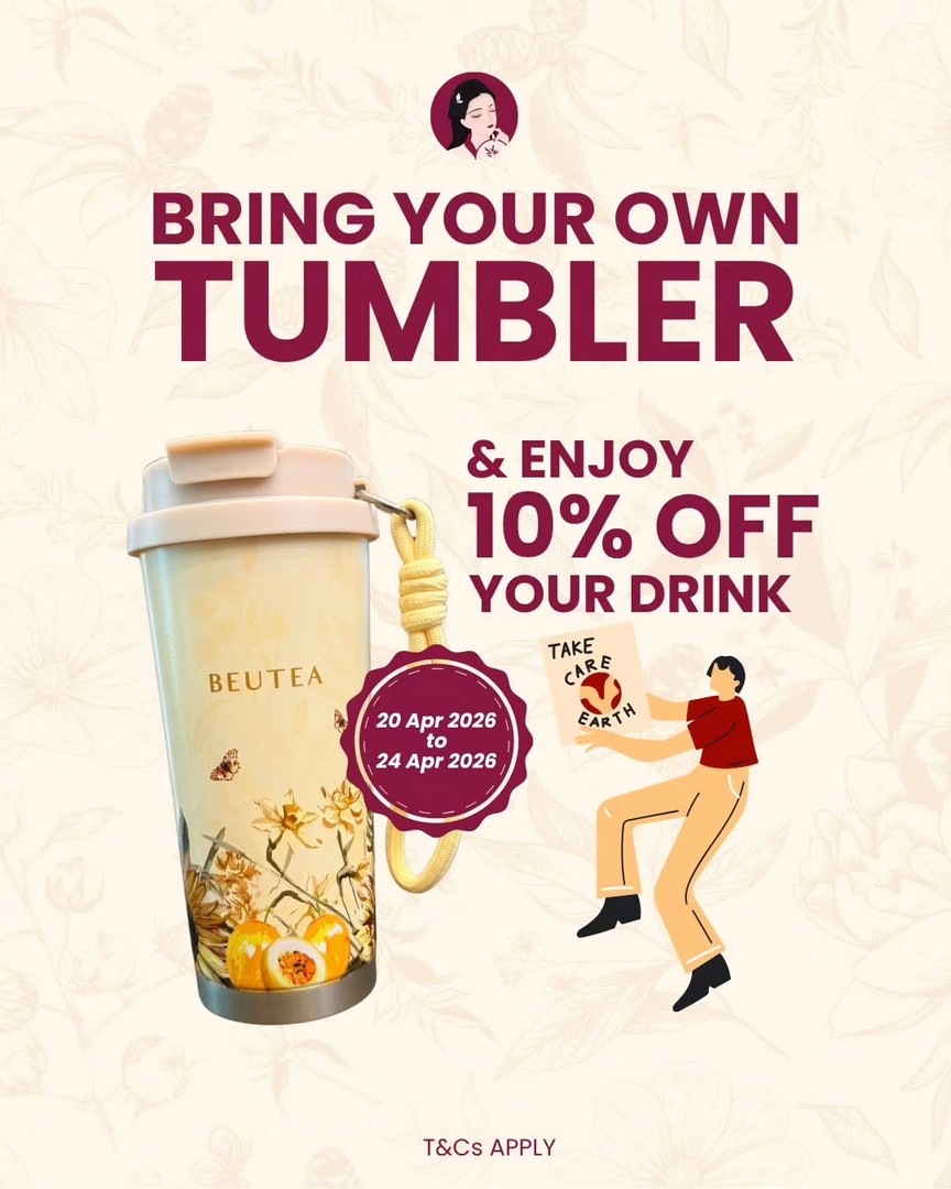 From 20 to 24 April 2026, customers who bring their own tumbler will receive 10% off their drink purchase at participating Beutea outlets in Singapore. Each tumbler is valid for one discounted drink per transaction.