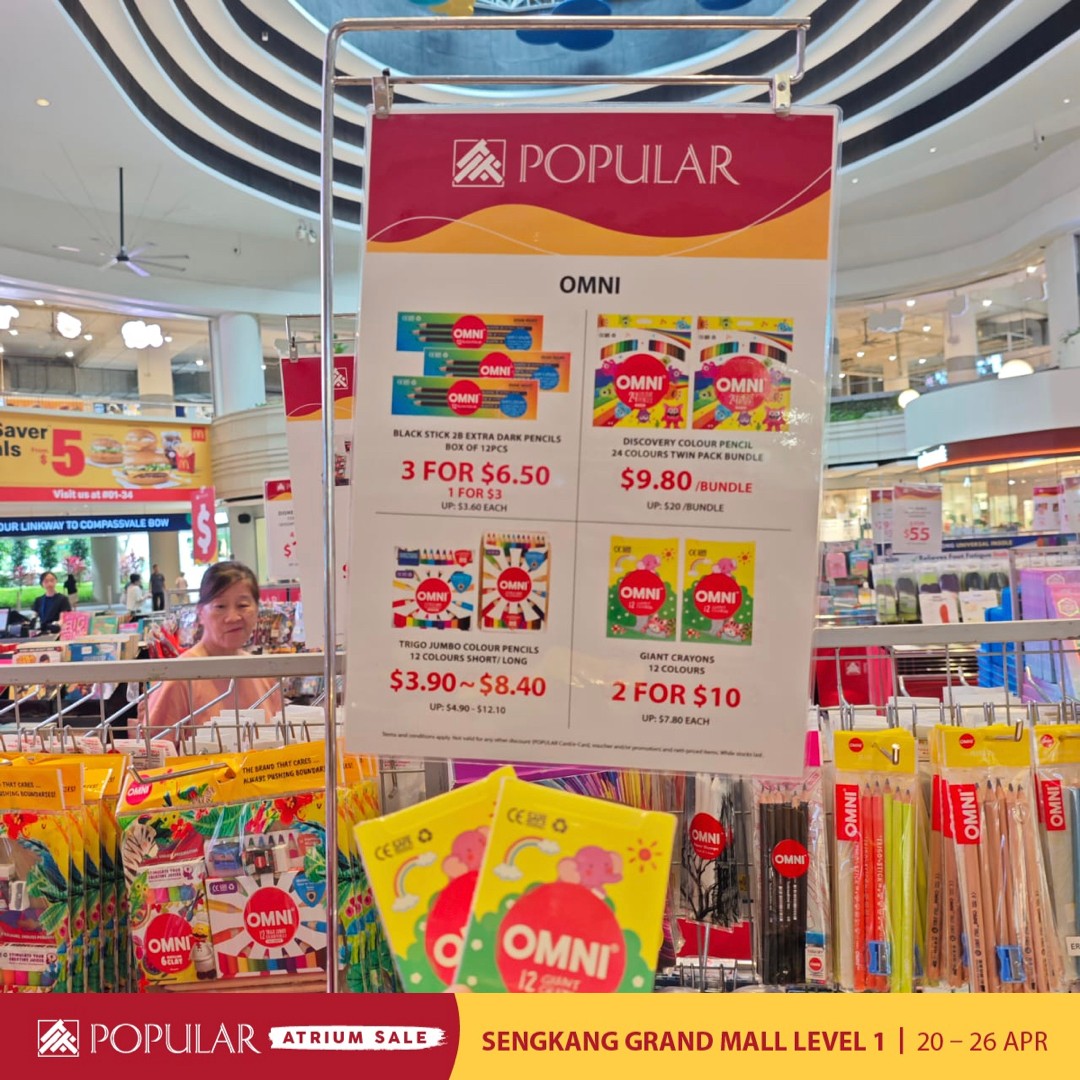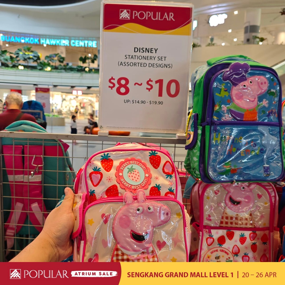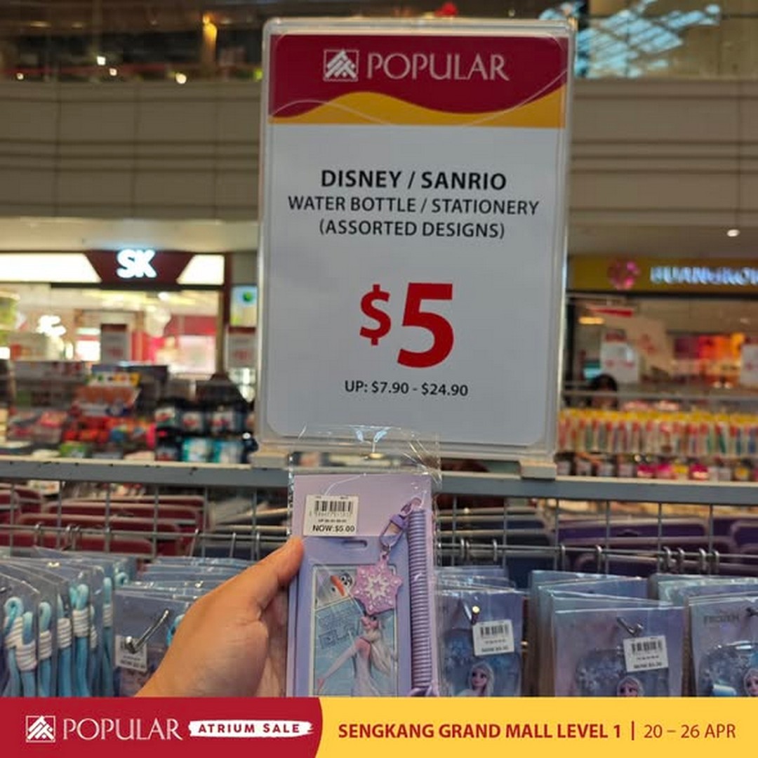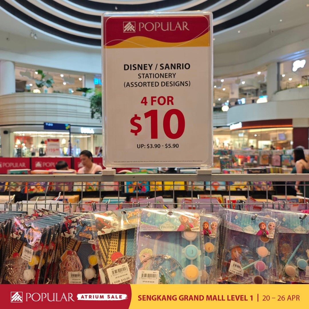 The Atrium Sale setup at Sengkang Grand Mall Level 1 is typically designed for easy browsing. Items are grouped into categories such as books, stationery, gift items, and school supplies. Clear discount labels help guide shoppers quickly to what they are looking for.