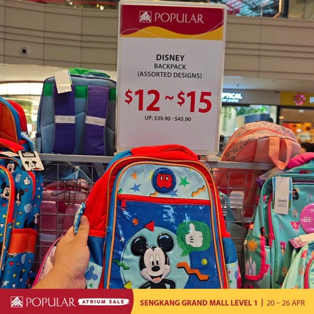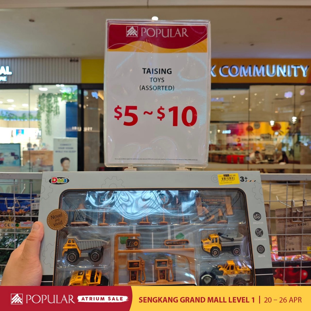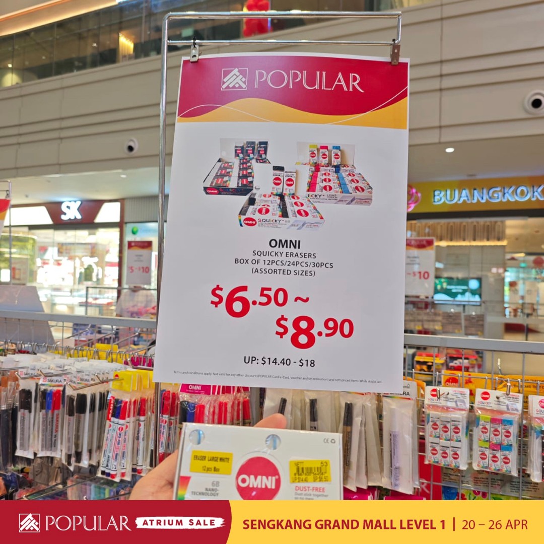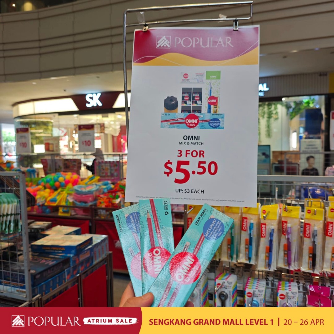 The Atrium Sale setup at Sengkang Grand Mall Level 1 is typically designed for easy browsing. Items are grouped into categories such as books, stationery, gift items, and school supplies. Clear discount labels help guide shoppers quickly to what they are looking for.