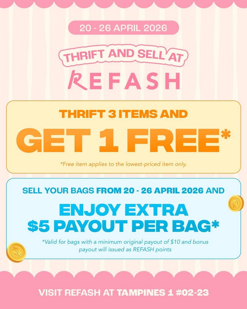 From 20 to 26 April 2026, REFASH at Tampines 1 is rolling out a promotion that is simple but surprisingly rewarding. The deal is straightforward: thrift three items and get one item free. On top of that, customers who are selling their pre-loved clothes through the store can enjoy an additional $5 payout per bag.
