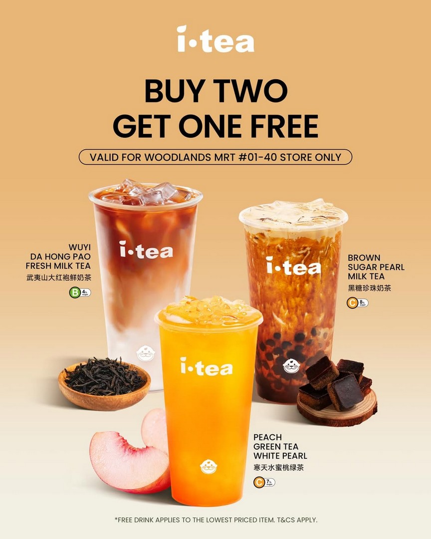 From 20 to 26 March 2026, iTEA is celebrating the launch of their new outlet at Woodlands MRT Station with a straightforward yet irresistible deal: Buy 2 drinks and get 1 free. It is one of those promotions that does not require much thinking. If someone is already planning to grab a drink with friends, they might as well make it count.