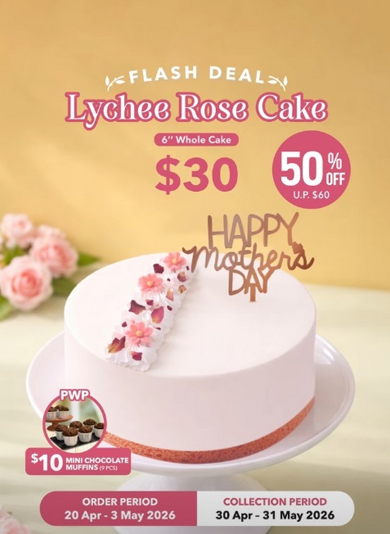 From 20 April to 3 May 2026, they are offering their beautifully crafted Lychee Rose Cake (6-inch) at 50% off, bringing the price down to just $30. For those who have bought celebration cakes in Singapore before, they will know this is quite a significant reduction, especially for a cake that carries both flavour sophistication and presentation appeal.