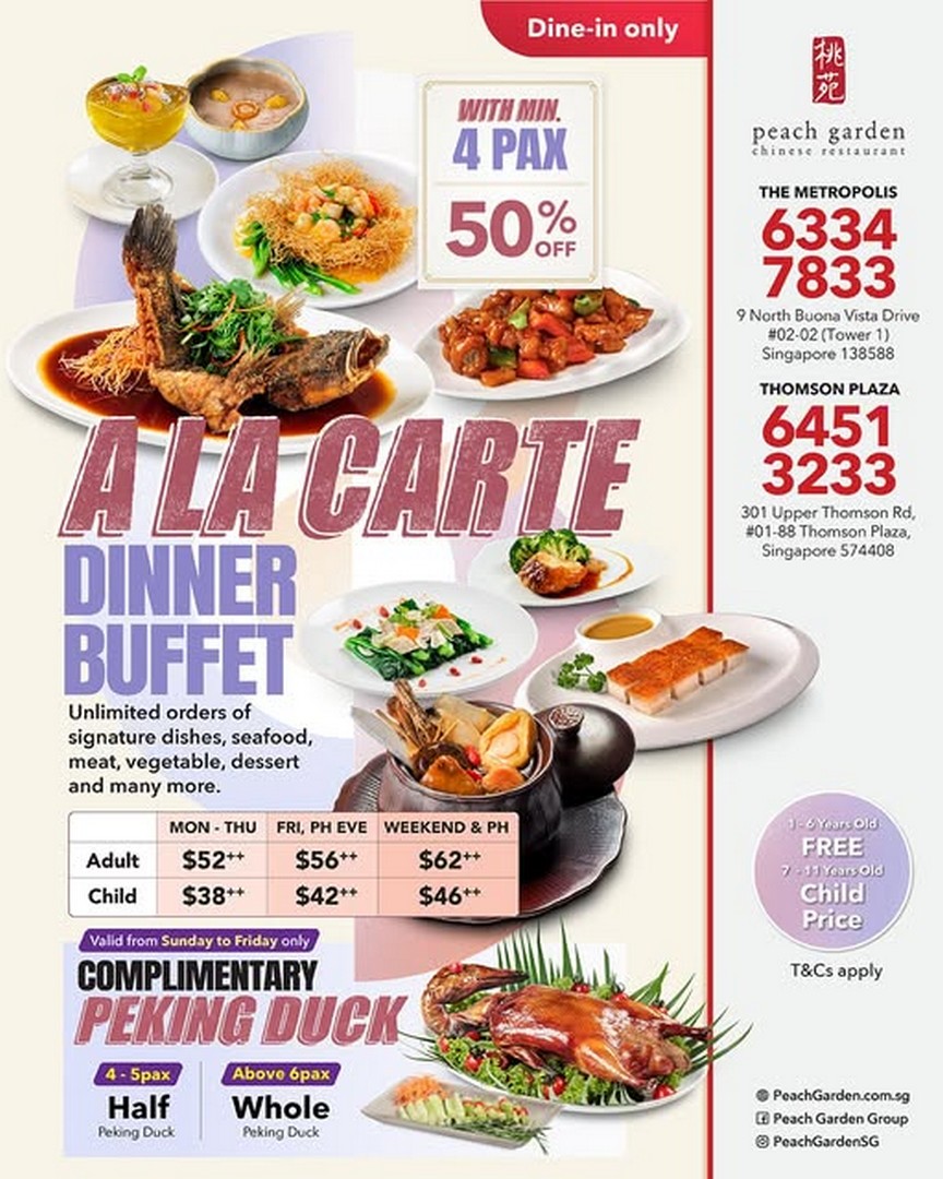 In summary, Peach Garden’s a la carte dinner buffet promotion offers: unbeatable value with 50% off for groups of four or more, a luxurious complimentary Peking Duck, a diverse menu catering to all tastes, and a comfortable, elegant dining environment. The combination of these elements makes this offer a must-try for anyone looking to enjoy a memorable evening out without stretching the wallet.