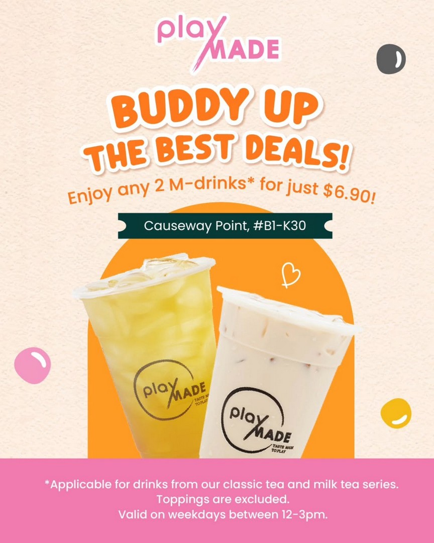 Beverage OffersBubble TeaCauseway PointLunch PromotionsMidday TreatsMilk TeaPlaymadeSingapore Deals