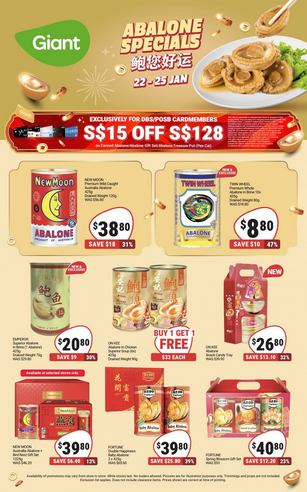 Shoppers holding DBS or POSB credit and debit cards can enjoy an extra layer of savings on top of the already discounted prices. With this promotion, they can redeem S$15 off on a minimum spend of S$128 for Canned Abalone, Abalone Gift Sets, and the luxurious Abalone Treasure Pot (Pen Cai). This exclusive offer is available at selected Giant stores across Singapore, with limited redemptions, so it is best to plan a visit early to take full advantage of the savings.