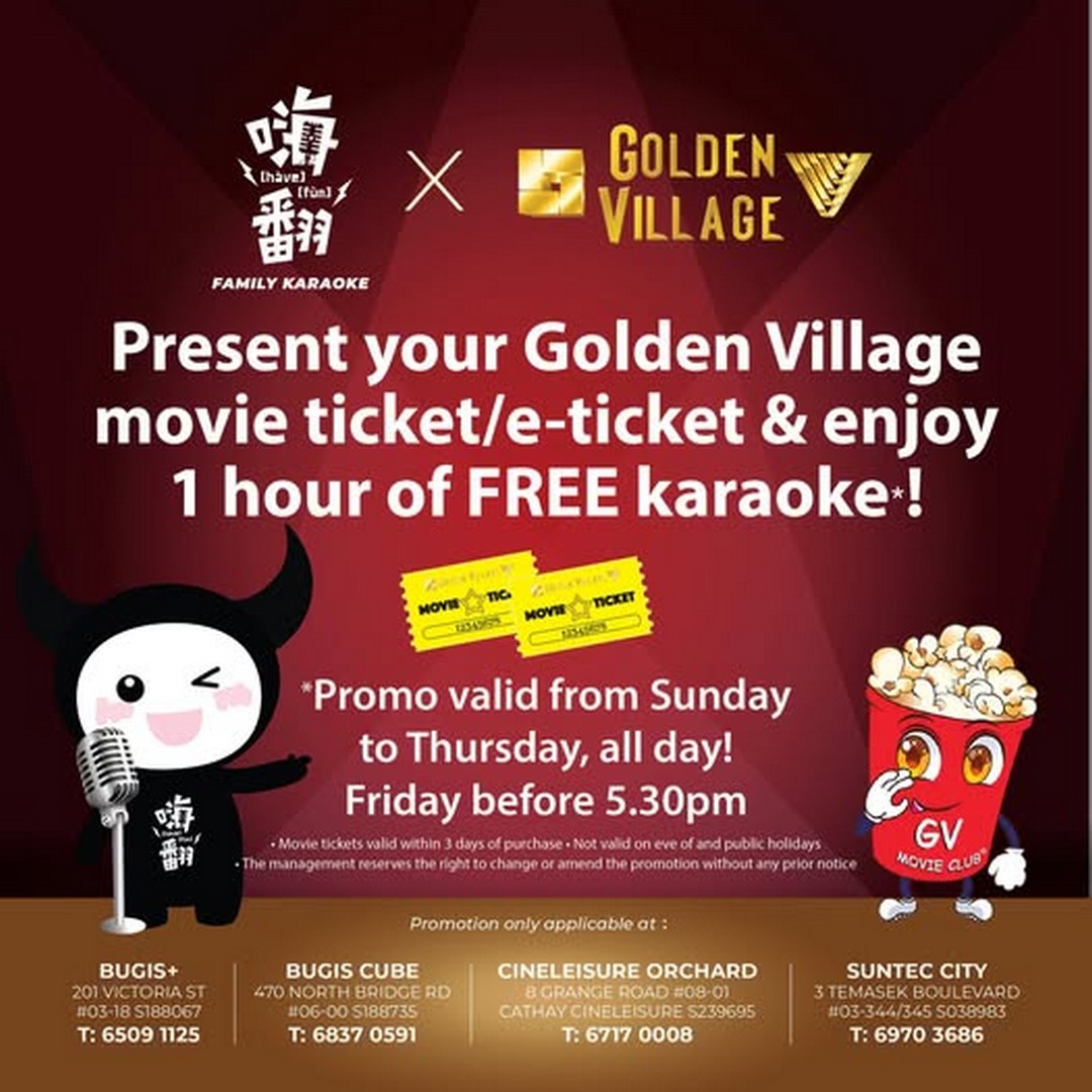 Yes, you read that right. With every Golden Village movie ticket, HaveFun Karaoke is offering one full hour of complimentary singing. That means after sitting through an intense thriller, a heart-warming drama, or even a musical, you and your friends can extend the fun by belting out your favourite songs in a comfortable karaoke room, without having to pay extra for the first hour.