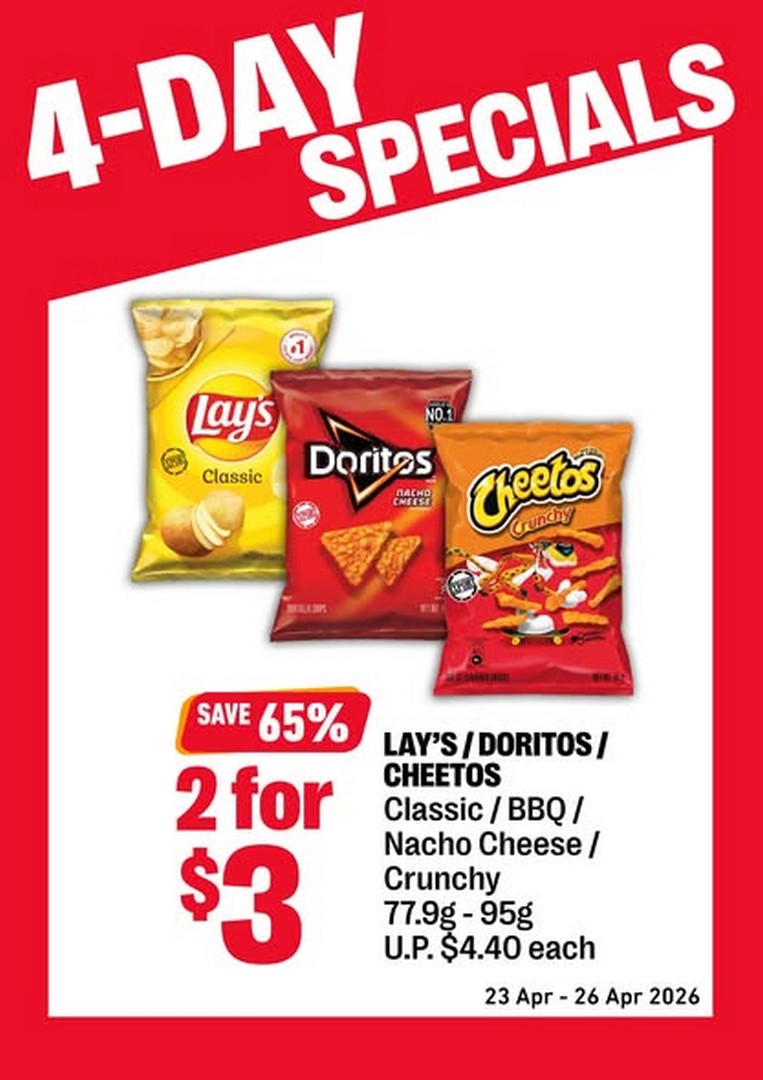 Lay’s, Doritos, Cheetos and similar popular snack brands are going at 2 for $3, with the usual price at $4.40 each. This is the kind of deal that tends to trigger “just one more flavour” thinking.