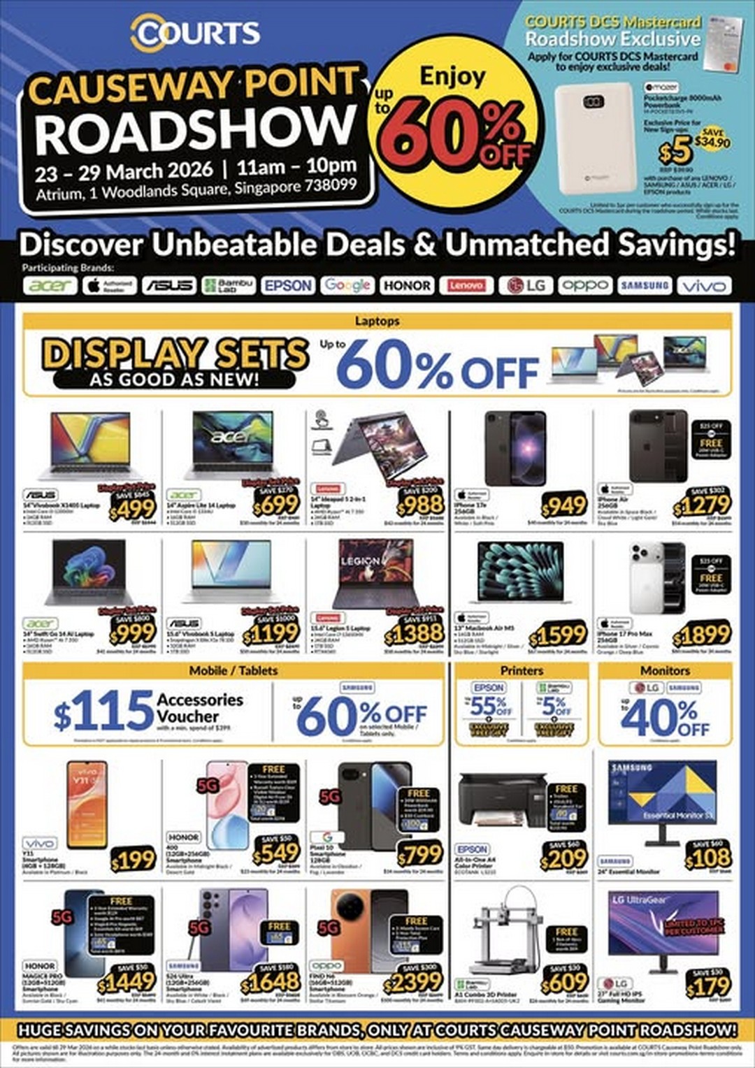 In summary, the COURTS Roadshow at Causeway Point is shaping up to be a must-visit event for anyone in Singapore interested in electronics and IT gadgets. With discounts of up to 60%, a stellar selection of top brands, and the hands-on shopping experience that only a roadshow can provide, there is plenty of reason to make the trip. From now until 29 March 2026, shoppers have the perfect chance to secure quality gadgets at unbeatable prices before stocks run out. For those who love technology and great deals, this is one of the events of the season.