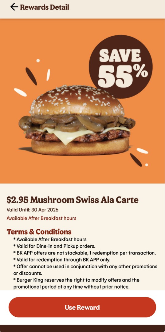 To access the deal, the Burger King mobile app must be downloaded. Once inside the app, the Mushroom Swiss Burger reward can be found and selected for redemption. After breakfast hours, the voucher becomes usable for dine-in or takeaway orders.