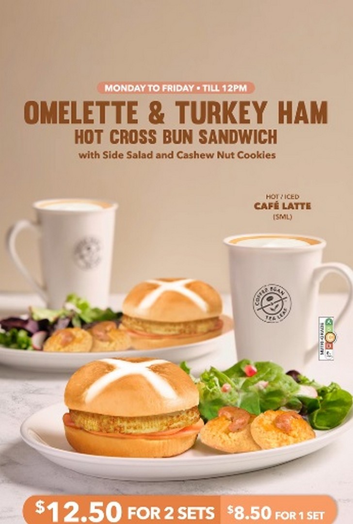 Mornings are often the toughest part of the day, and finding a breakfast that’s quick, satisfying, and still indulgent can feel like a challenge. Fortunately, for those in Singapore who enjoy a café-style breakfast without the fuss, The Coffee Bean & Tea Leaf Singapore has rolled out a tempting breakfast promotion that’s hard to resist. From 23 February 2026 onwards, coffee lovers and breakfast enthusiasts can start their day on a delicious note with the Omelette & Turkey Ham Hot Cross Bun Sandwich breakfast set. This offering combines the comforting flavours of a classic hot cross bun with a wholesome omelette and turkey ham filling, perfectly paired with seasonal side items and a refreshing café latte.