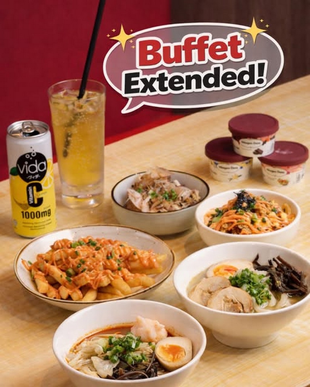For 90 minutes, diners can enjoy unlimited servings of ramen, sides, and omu rice, making it an ideal treat for those who love to savour every bite. But that’s not all—there’s also free-flow Häagen-Dazs ice cream to round off the meal, a sweet finale that elevates this dining experience from great to exceptional. With over 25 dishes available, this buffet is perfect for families, friends, and anyone looking to enjoy a hearty dinner.