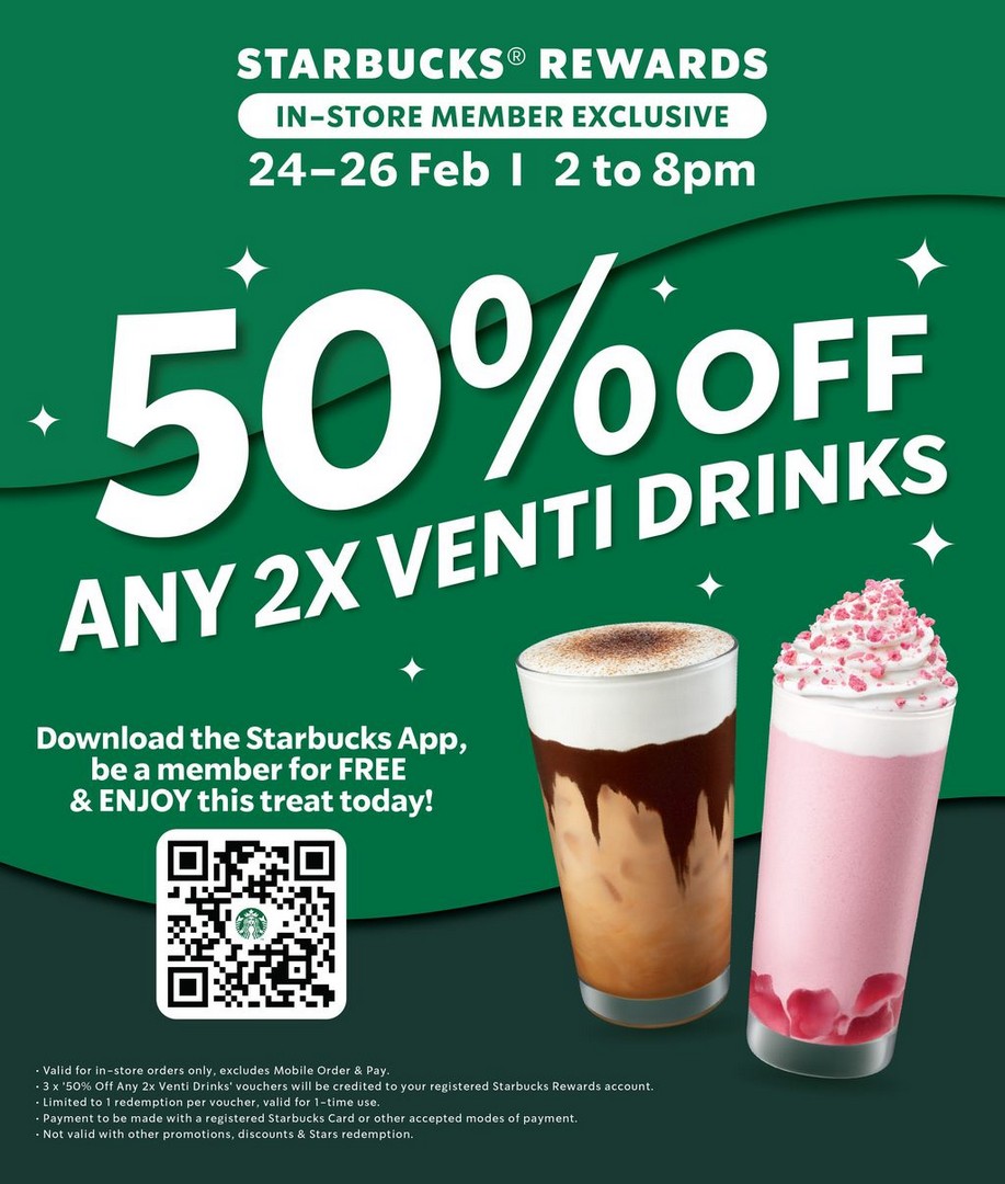 In conclusion, this Starbucks promotion is a well-crafted opportunity to indulge, save, and enjoy the simple pleasures of life. From 24 to 26 February 2026, between 2 PM and 8 PM, Starbucks® Rewards members in Singapore can enjoy 50% off two Venti drinks in-store. It’s a promotion that blends value, indulgence, and experience — a trifecta that makes it highly appealing to coffee enthusiasts and casual drinkers alike. Whether they are seeking a mid-afternoon pick-me-up, a reason to catch up with a friend, or simply a chance to enjoy their favourite drinks at a reduced price, this is one deal they shouldn’t miss.
