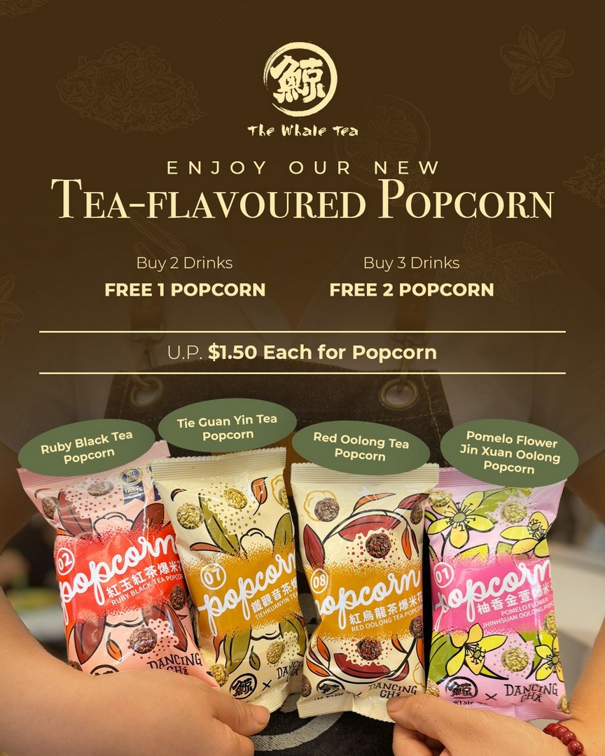 Starting from 24 January 2025, The Whale Tea is offering a promotion that gives customers free tea-flavoured popcorn with their drinks. For every two drinks purchased, patrons receive one complimentary packet of popcorn, while buying three drinks earns two packets free. At a usual price of $1.50 per packet, this makes the offer a wonderful value-add for anyone looking to combine beverages with a light snack.