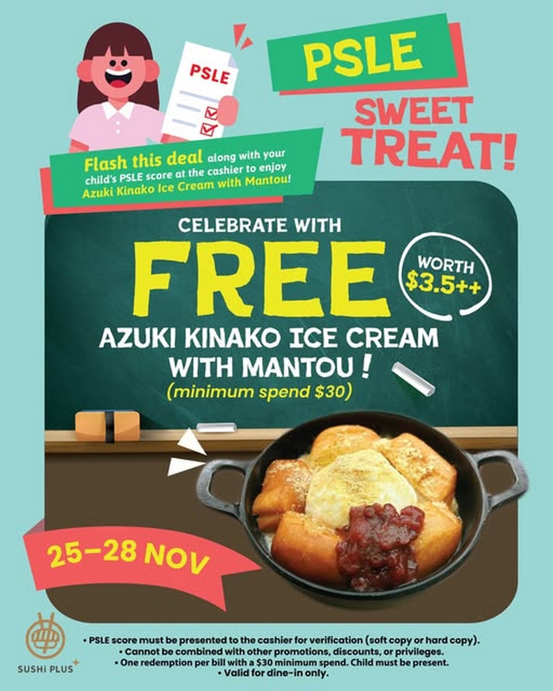 Redemption Requirement: Present PSLE score (soft or hard copy), minimum spend of $30, one redemption per bill, child must be present, dine-in only, not valid with other promotions.