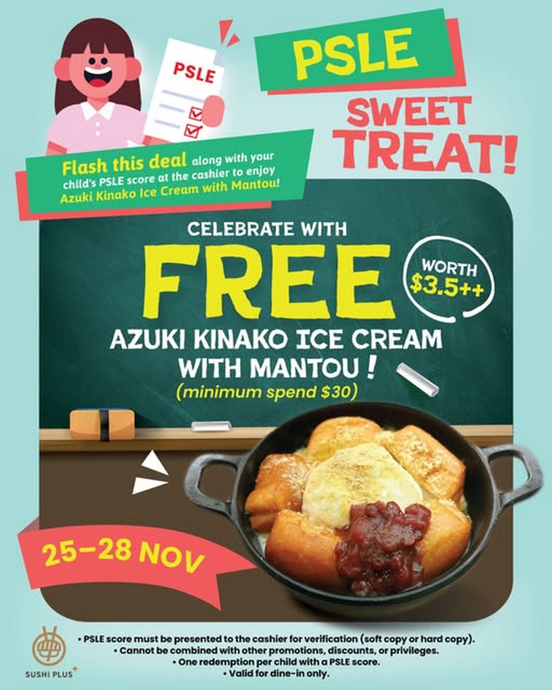 From 25 to 28 November 2025, Sushi Plus is giving families the chance to redeem a complimentary Azuki Kinako Ice Cream with Mantou, usually priced at around $3.50++, with a minimum spend of $30. For many families, Sushi Express and Sushi Plus have become familiar names for convenient, casual dining with consistent quality. This promotion offers an added reason to drop by, especially for families already thinking of a small treat after the release of exam results.