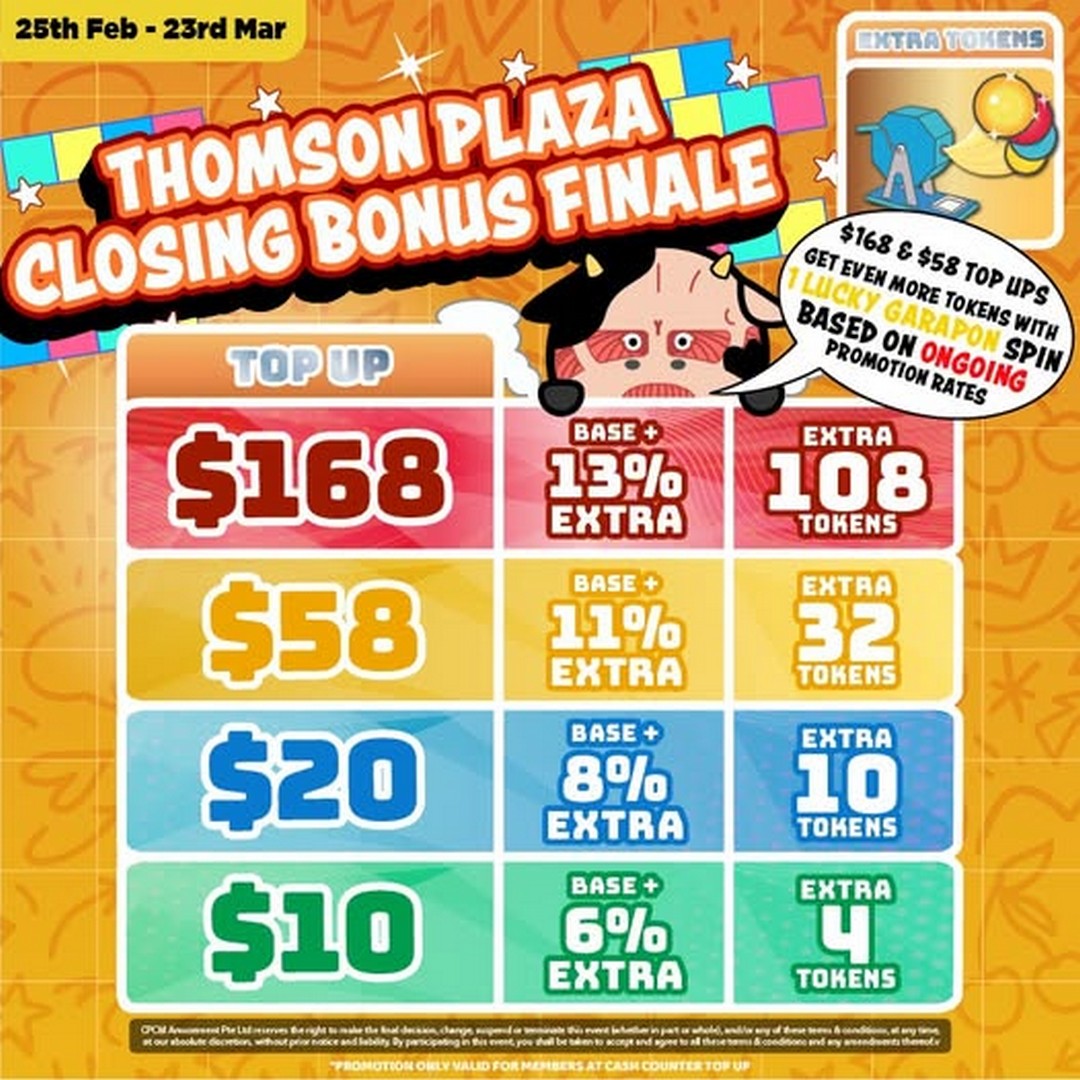 From 25 February to 23 March 2026, Cow Play Cow Moo is running a Thomson Plaza Closing Bonus Finale Promotion, offering up to 108 extra tokens exclusively at their Thomson Plaza outlet. As they prepare to bid farewell to this location, they are thanking customers with a final top-up bonus that is genuinely worth taking advantage of.