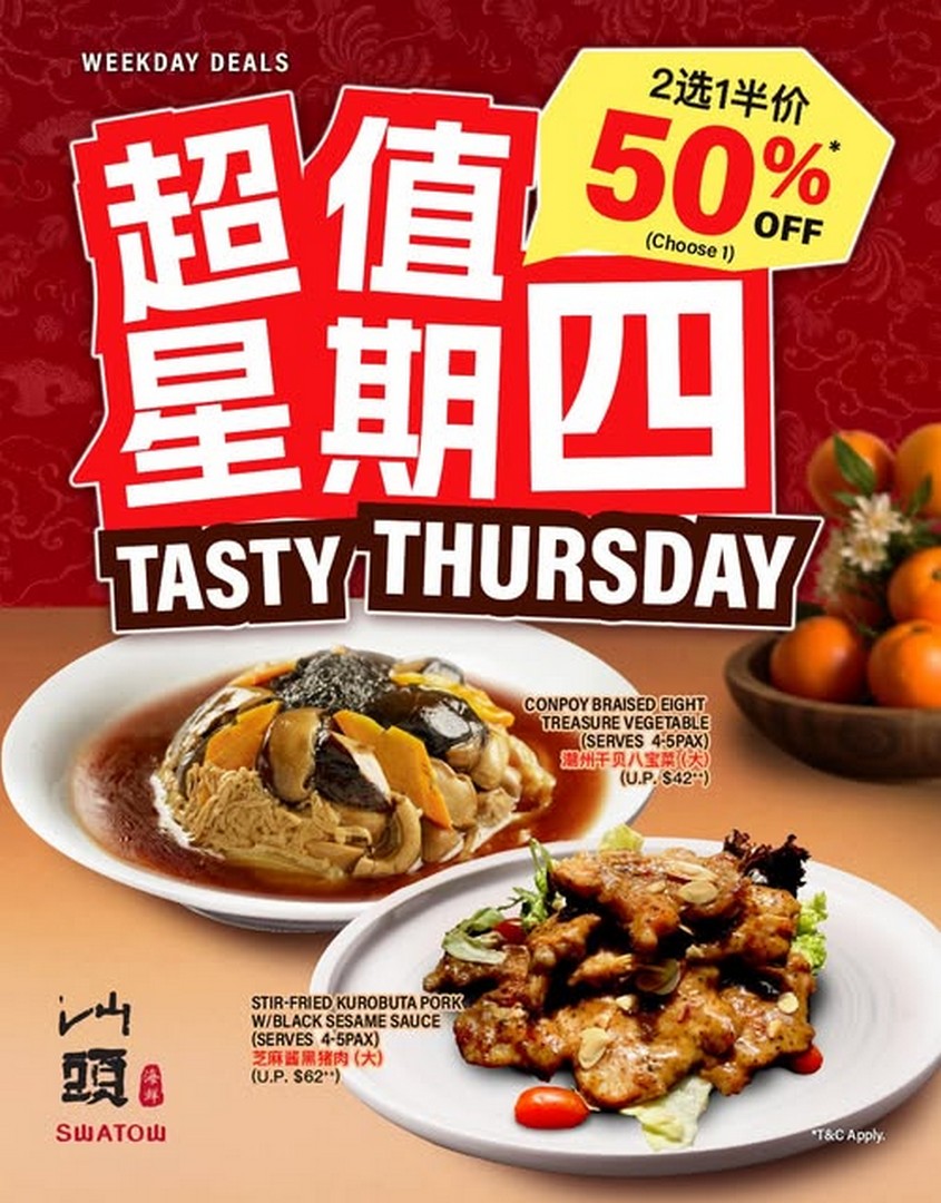 In conclusion, if you are looking for a way to make your Thursdays more enjoyable, the Tasty Thursday promotion at Swatow Seafood Restaurant is a must-visit. With 50% off on the Conpoy Braised Eight Treasure Vegetable and Stir-Fried Kurobuta Pork with Black Sesame Sauce, diners can indulge in authentic Teochew classics, explore more menu options, and share a memorable meal with friends, family, or colleagues. Don’t miss out on this midweek treat that combines affordability, flavour, and a welcoming dining experience.