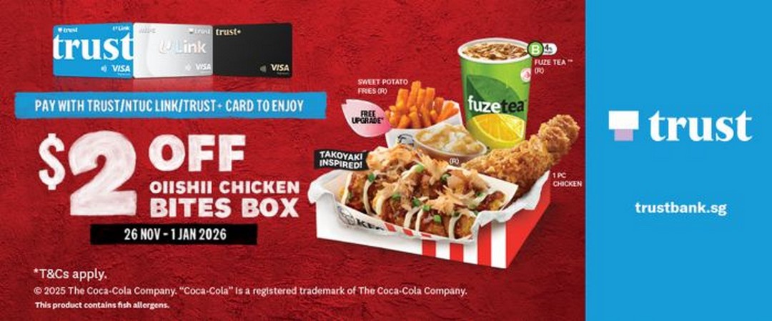 In summary, KFC’s Trust card promotion is an easy, convenient, and flavourful way to enjoy a meal this festive season. With a generous campaign period spanning over a month, broad availability across Singapore (with a few exceptions), and the chance to try a unique seasonal menu item at a discounted price, this deal is one that food lovers shouldn’t overlook. Whether you are a regular KFC fan or someone looking to try something new, the Oiishii Chicken Bites Box at $2 off provides both great taste and unbeatable value.