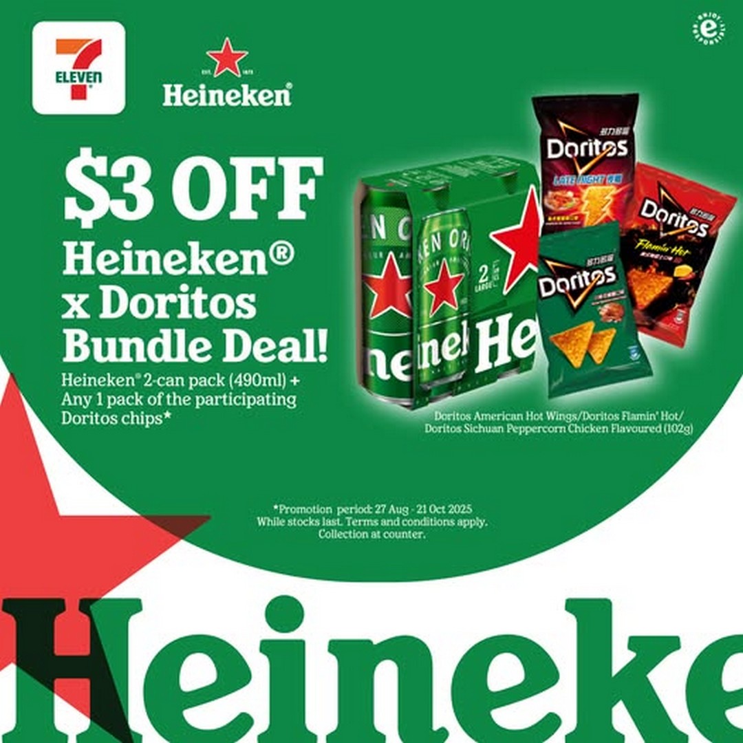 If there’s one way to elevate an ordinary day into something more exciting, it’s by combining a refreshing drink with a bold snack. 7-Eleven Singapore is turning up the heat this season with their latest Heineken and Doritos bundle promotion, designed for those who appreciate a little flavour adventure. Running from 27 August to 21 October 2025, this limited-time offer gives customers $3 off every purchase of a Heineken 2-can pack (490ml) paired with any one of three distinctive Doritos flavours: American Hot Wings, Flamin’ Hot, or Sichuan Peppercorn Chicken.