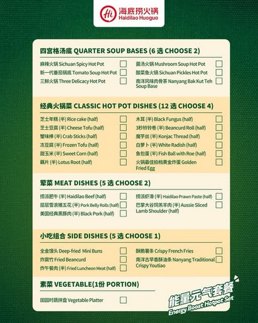 Haidilao has long been synonymous with high-quality hotpot experiences in Singapore, and this special promotion continues that tradition while offering incredible value. The Energy Boost Hotpot Set isn’t just a meal; it’s an invitation to enjoy a fully customised dining experience. Diners can select two types of meats, four classic dishes, and a side dish from a carefully curated list. That means whether someone is craving beef, chicken, seafood, or vegetables, they have the freedom to create the perfect combination that suits their taste.