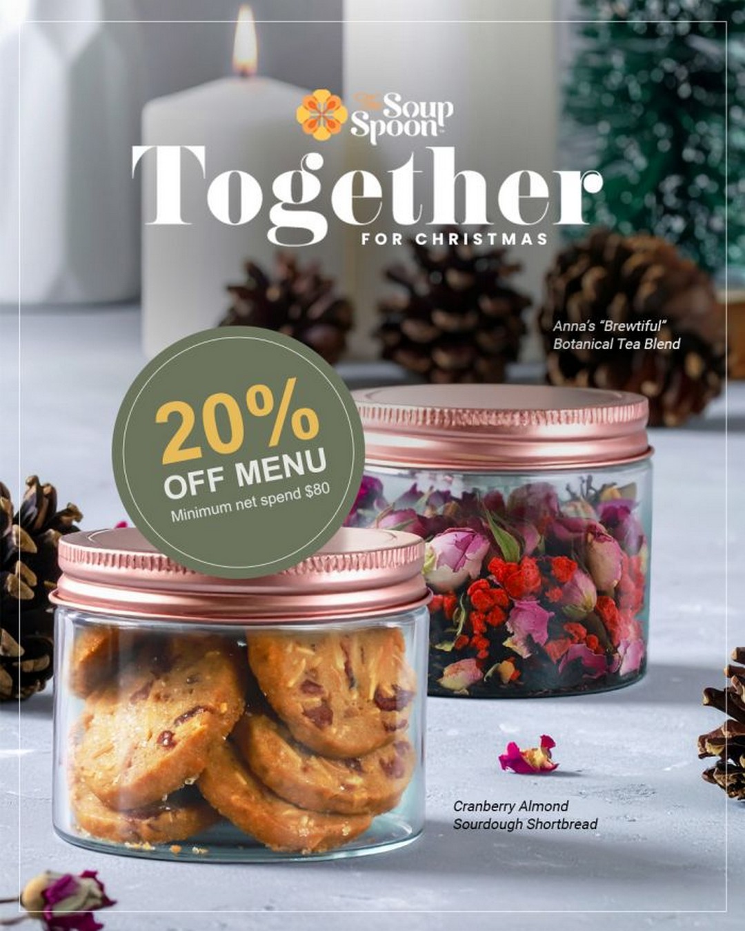Details: Enjoy 20% off menu with a minimum net spend of $80. Receive a complimentary Cranberry Almond Sourdough Shortbread and “Brewtiful” Botanical Tea Blend with every festive set purchased. Offers valid while stocks last.