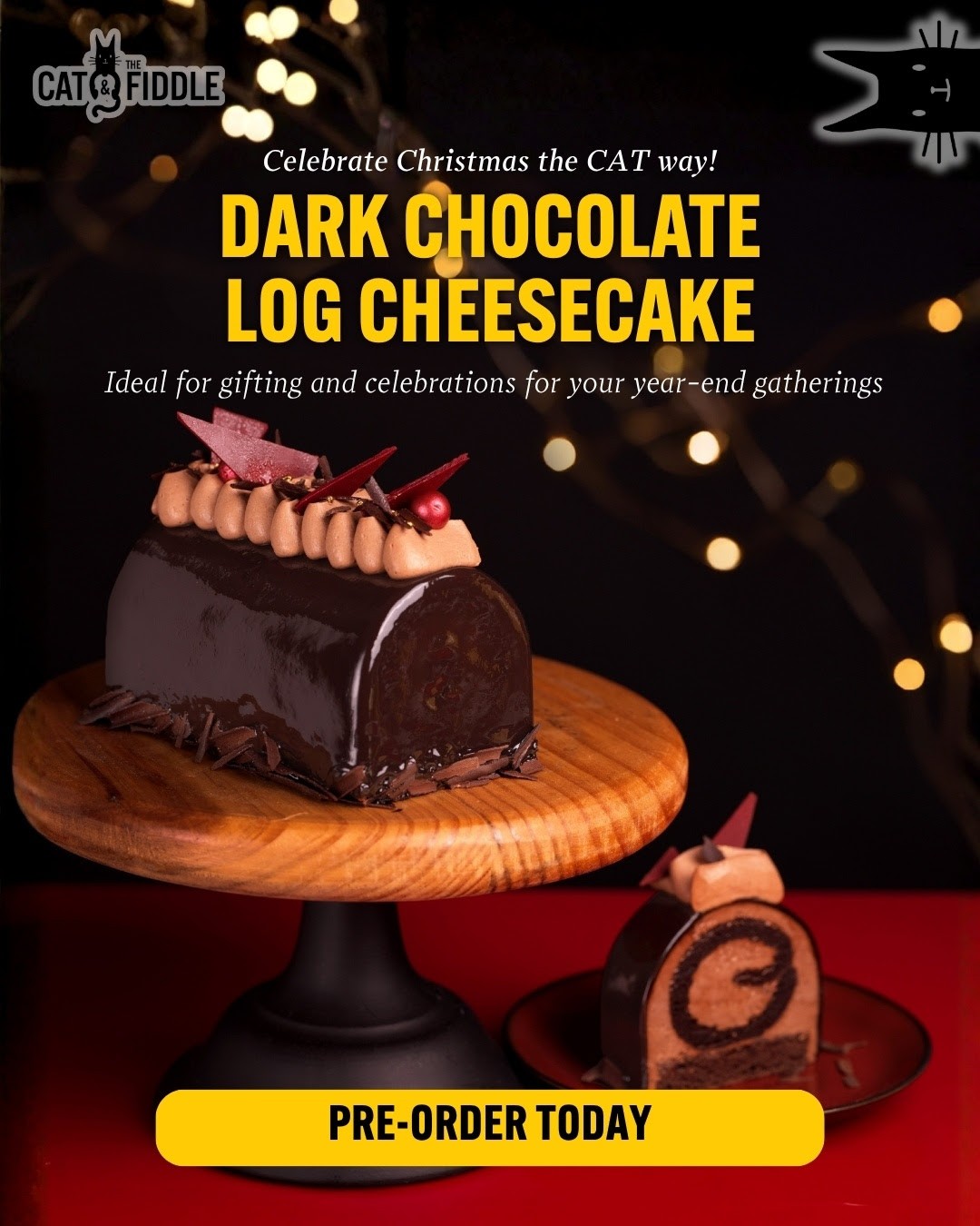 In conclusion, the Dark Chocolate Log Cheesecake by Cat & the Fiddle is not just another holiday dessert—it’s a decadent experience designed for those who value sophistication, flavour, and festive presentation. From its glossy dark chocolate exterior to the creamy, melt-in-your-mouth cheesecake filling, it’s a dessert that delights the senses and adds a touch of luxury to any occasion. Available online from 27 October 2025 onwards, it’s an indulgence worth experiencing for yourself or sharing with loved ones. Whether you’re planning a holiday gathering, seeking a thoughtful gift, or simply craving a sophisticated treat, this promotion provides a perfect opportunity to enjoy something special.