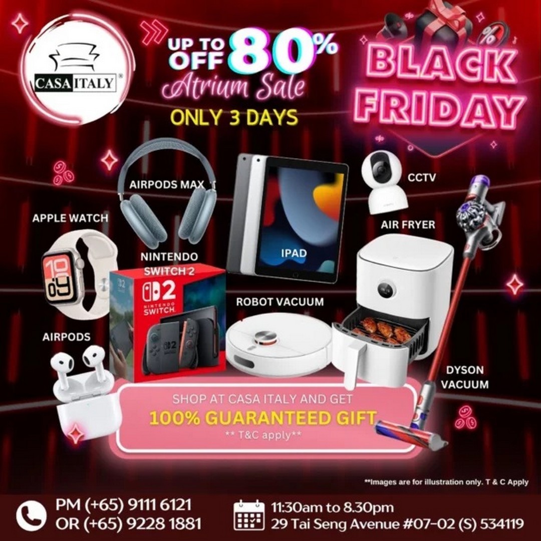 One of the most exciting perks of Casa Italy’s Black Friday event is the guaranteed gift with every purchase, subject to terms and conditions. Shoppers can look forward to popular items like Nintendo Switch 2, AirPods Max, AirPods, iPad, Apple Watch, Dyson vacuum cleaners, Xiaomi robot vacuums, Xiaomi air fryers, and Xiaomi CCTV cameras. While the images in promotional materials are for illustration purposes, the actual gifts add an extra layer of excitement to every purchase.