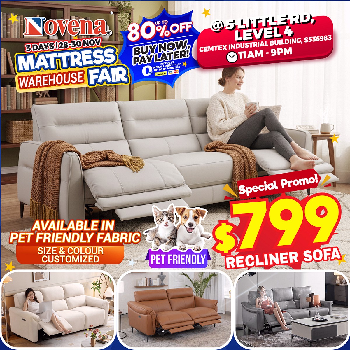 $799 Recliner Sofa, pet-friendly, available in five colours