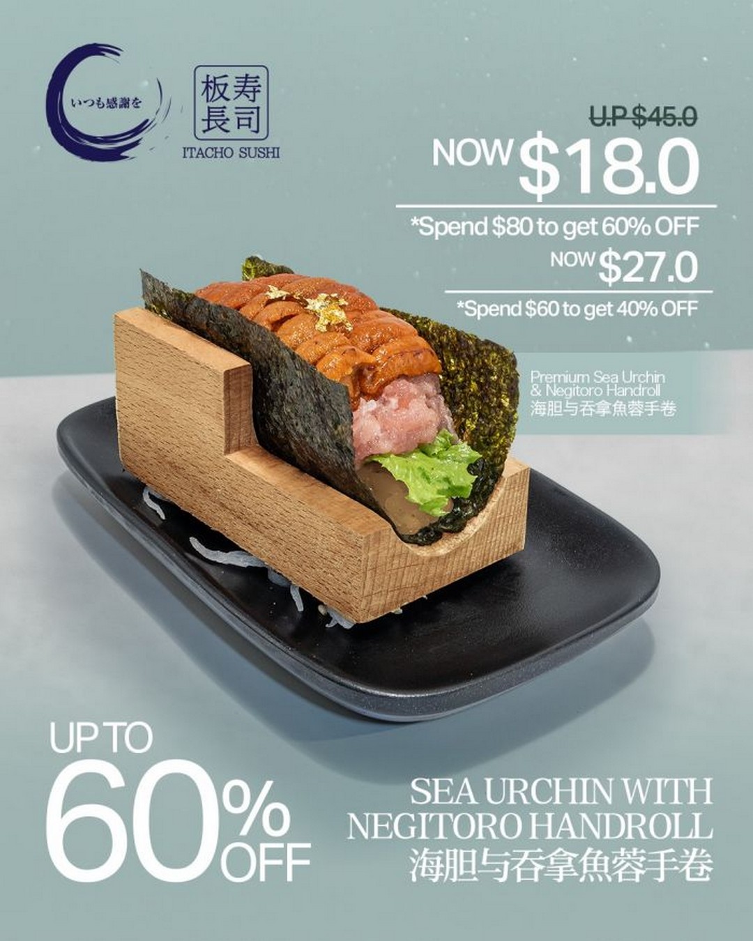 In conclusion, the Itacho Sushi Sea Urchin with Negitoro Handroll promotion is a must-try for anyone who appreciates premium sushi. With discounts up to 60%, diners can enjoy a luxurious handroll at an unbeatable price. The combination of creamy uni, rich negitoro, and crisp seaweed offers a culinary experience that is both indulgent and satisfying. The simplicity of redemption, the accessibility of multiple outlets, and the opportunity to explore the menu further make this a promotion that should not be missed. For anyone in Singapore looking to enjoy high-quality sushi without the hefty price tag, now is the perfect time to head to Itacho Sushi and savour this exquisite handroll.