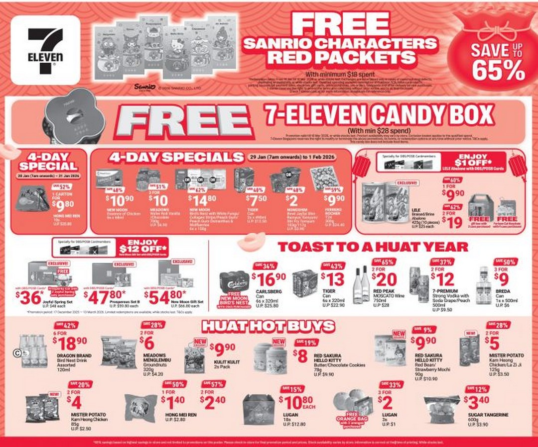 FREE Sanrio Characters Red Packets: Customers spending a minimum of $18 can redeem these from 14 January to 10 March 2026. Perfect for adding a playful touch to your festive ang baos or as gifts for loved ones.