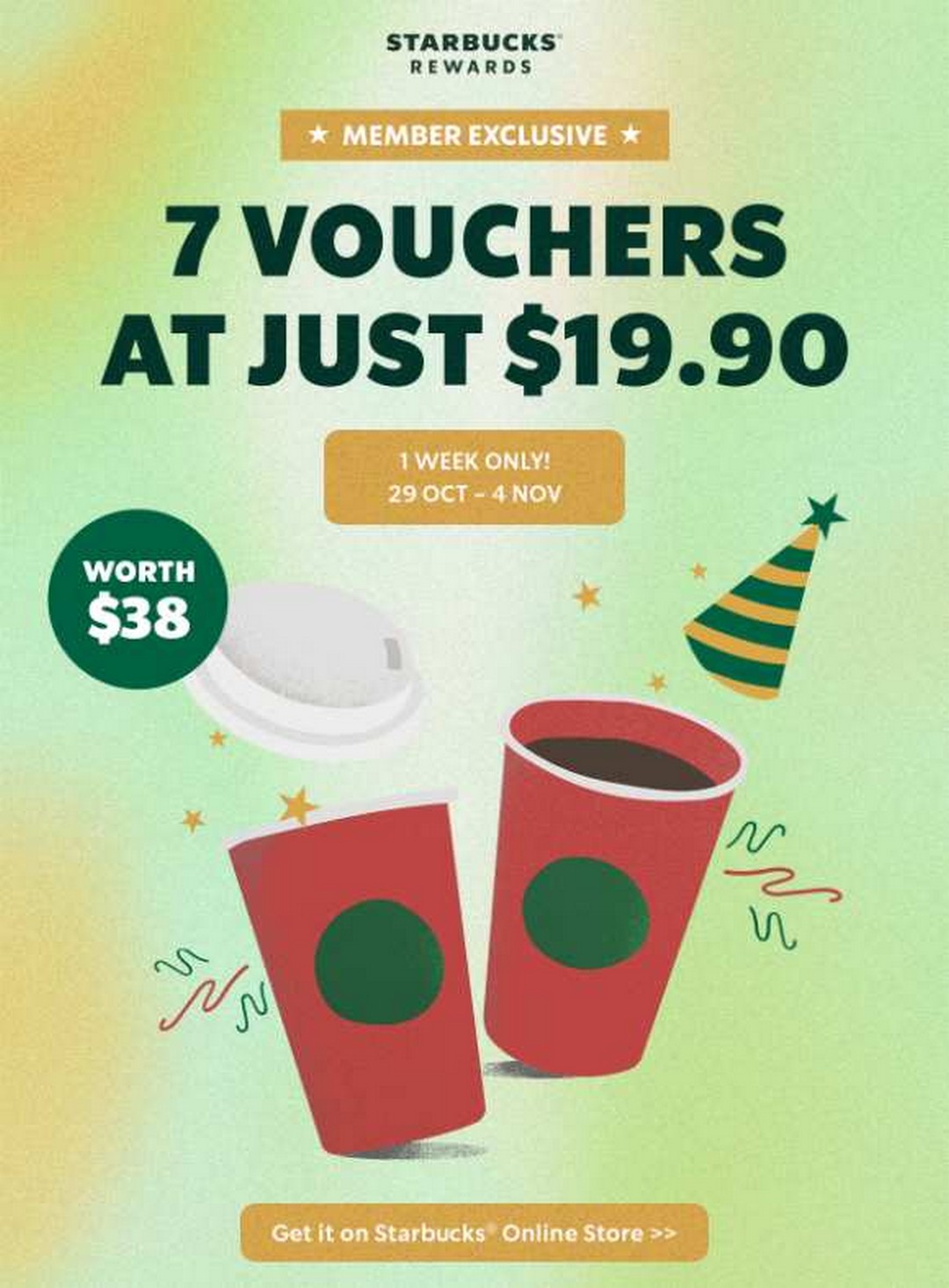 If you’re the sort who can’t start the day without a good cup of coffee, this week’s Starbucks promotion is one you’ll want to jump on. From 29 October to 4 November 2025, Starbucks Singapore is running a limited-time offer that lets coffee lovers enjoy seven exclusive vouchers for only $19.90, down from the usual $38. It’s not just a deal — it’s practically a caffeine jackpot.