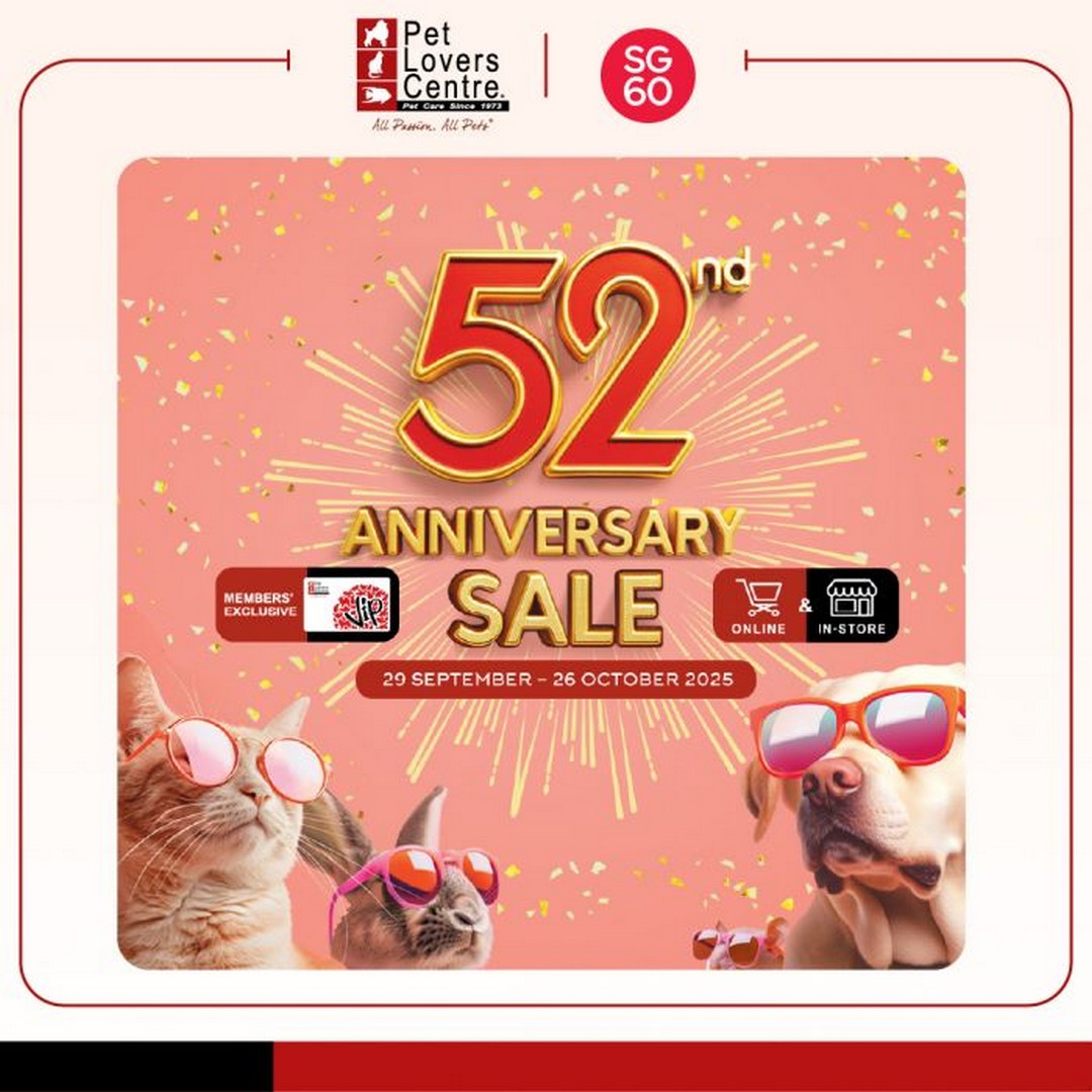 This month, Pet Lovers Centre is celebrating a remarkable milestone—52 years of providing Singaporeans with trusted products and services for their pets. To mark this special occasion, they are running their 52nd Anniversary Sale, offering members-exclusive discounts across a wide range of pet food, treats, and supplies. Running from 29 September to 26 October 2025, this sale is available both online and in all participating Pet Lovers Centre stores in Singapore.