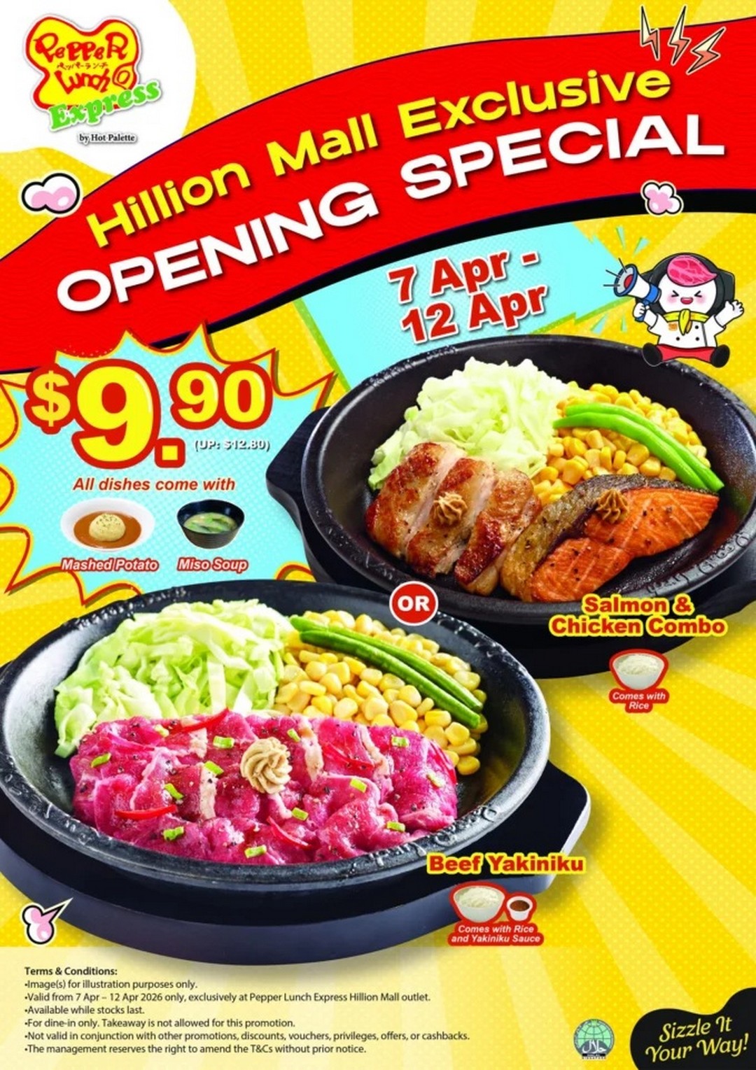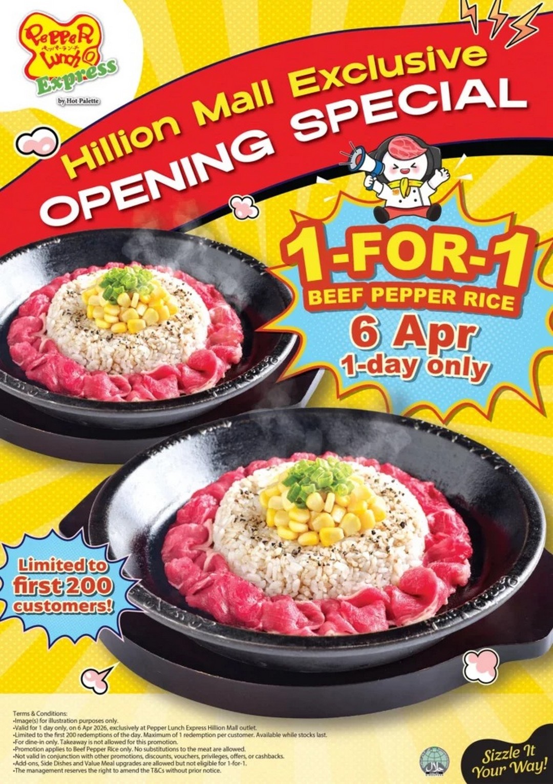 - 6 April 2026 – 1-for-1 Beef Pepper Rice, Dine-in only, 17 Petir Road, #02-18, Hillion Mall, Singapore 678270