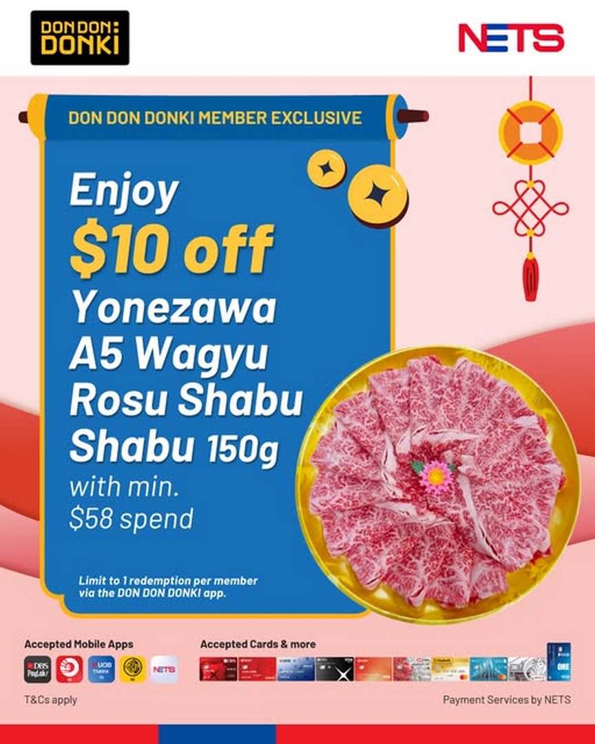 From 30 January to 1 March 2026, DON DON DONKI is offering $10 OFF Premium Yonezawa A5 Wagyu Rosu Shabu Shabu (150g) when customers spend $58 and above and pay using NETS. This promotion is available for redemption through the DONKI App and is valid while stocks last. For shoppers who enjoy premium Japanese beef but usually find it a little too indulgent for everyday spending, this deal presents a rare opportunity to enjoy top-tier wagyu at a more approachable price.