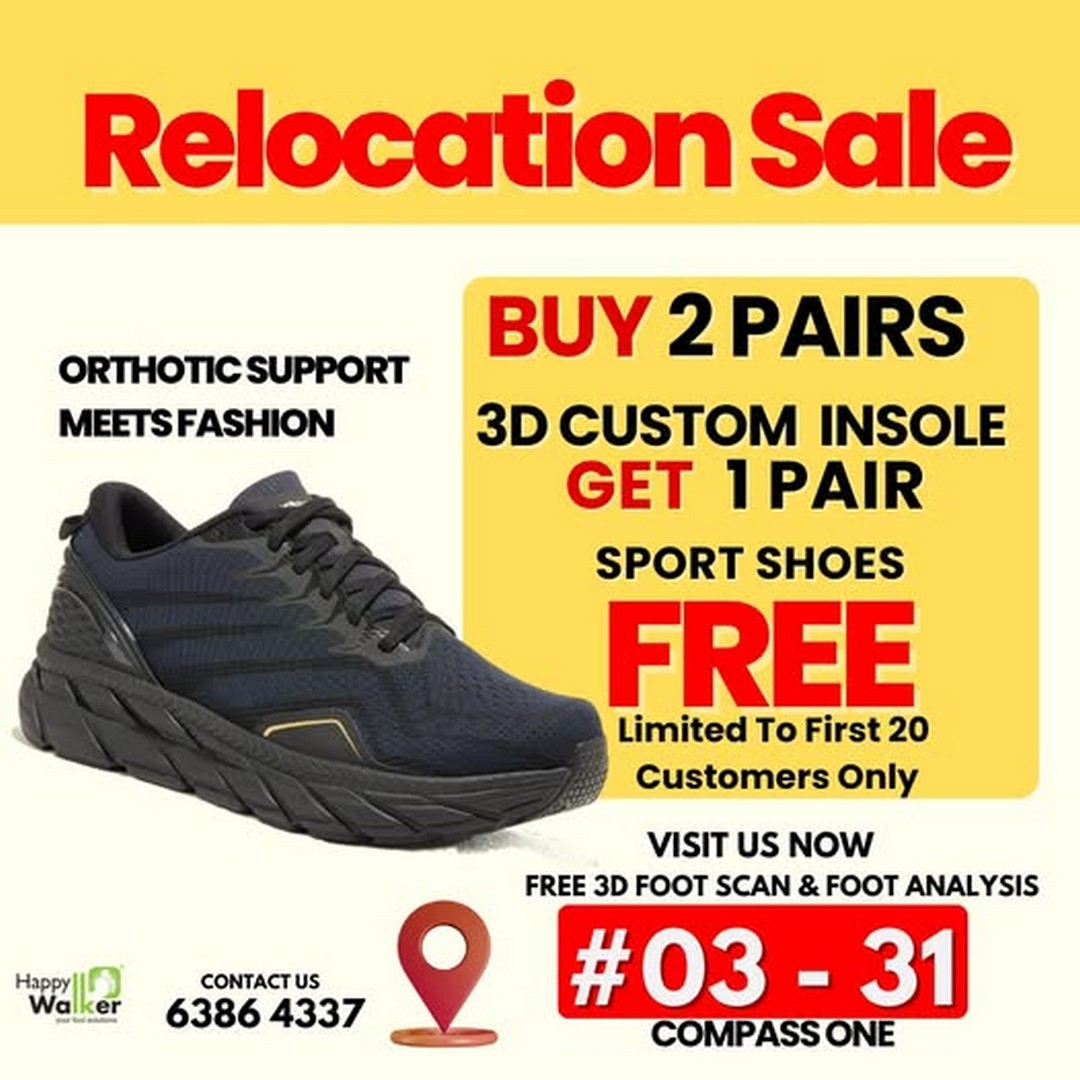 In summary, the Happy Walker relocation and new sport shoe launch is an event that brings together a perfect mix of style, comfort, and health benefits. It provides an exclusive opportunity for early shoppers to enjoy high-value footwear at a fraction of the usual price. For anyone passionate about maintaining foot health without compromising fashion, this is an event that should not be overlooked. The combination of orthotic insoles, stylish sport shoes, and the convenience of the new Compass One location makes it an unbeatable offer.