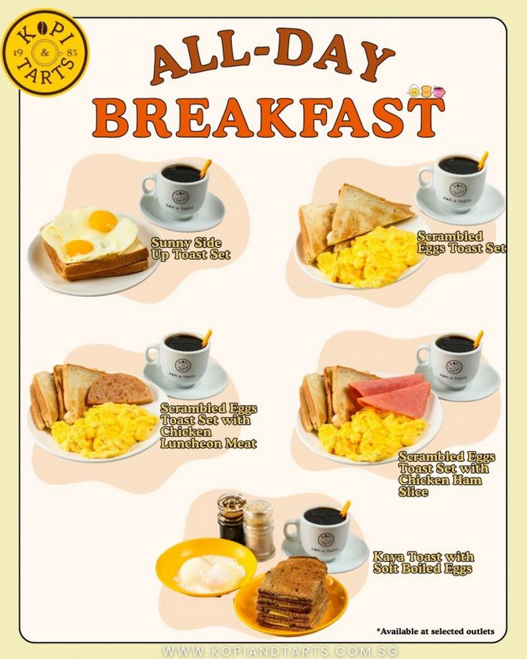 The All-Day Breakfast sets are only available at selected outlets, so it’s best to check with your nearest Kopi & Tarts branch before heading down.