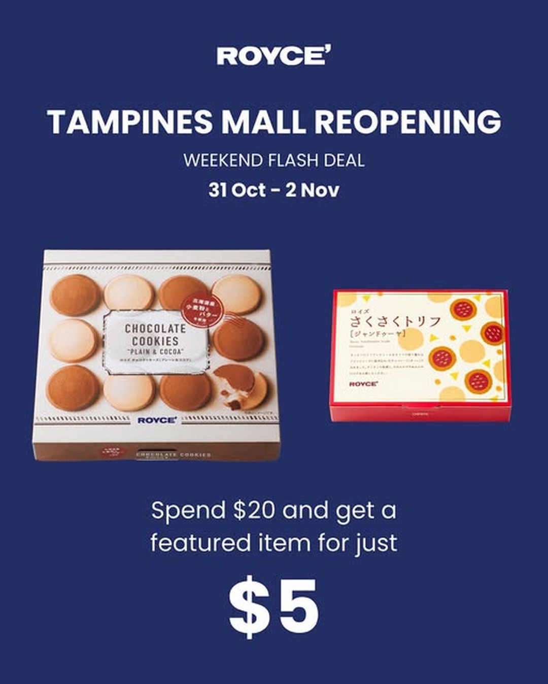 In summary, the ROYCE’ Tampines Mall Reopening Weekend promotion from 31 October to 2 November 2025 is a must-visit event for chocolate lovers in Singapore. With a minimum spend of $20, shoppers can enjoy a featured treat for just $5—a rare and enticing offer that allows them to indulge in premium chocolates without overspending. The event promises not only fantastic savings but also a memorable shopping experience in a newly reopened outlet. The limited quantities, single daily redemption, and exclusivity of the deal add to the excitement, making it a weekend to remember for both loyal fans and first-time visitors.