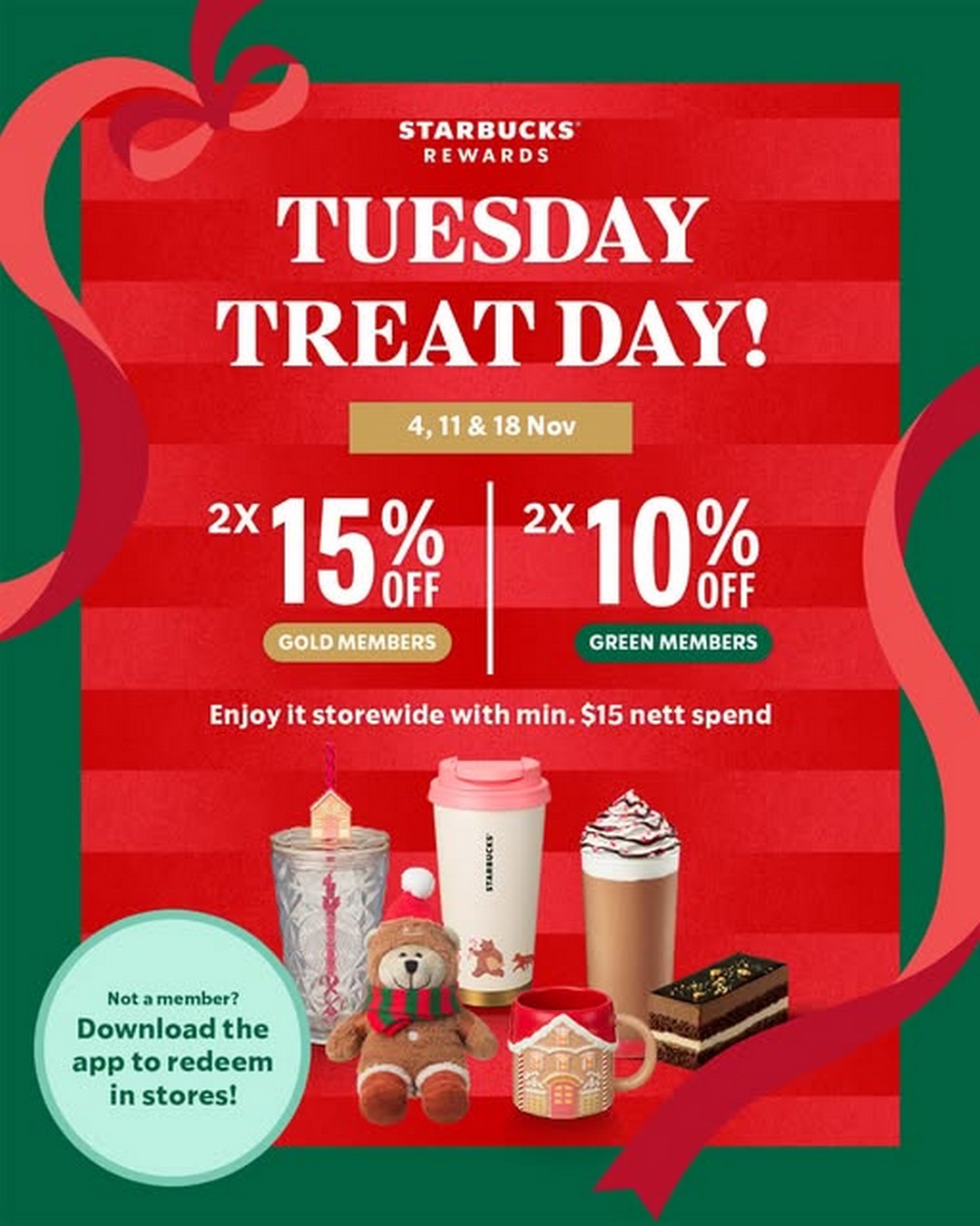 For those who are Gold members, this is your chance to enjoy 2X 15% off your purchases on select Tuesdays, while Green members get 2X 10% off. The promotion is valid on 4, 11, and 18 November 2025, making it a great excuse to plan a few coffee runs or a catch-up session with friends at your local Starbucks. To enjoy this deal, all it takes is a minimum nett spend of $15.