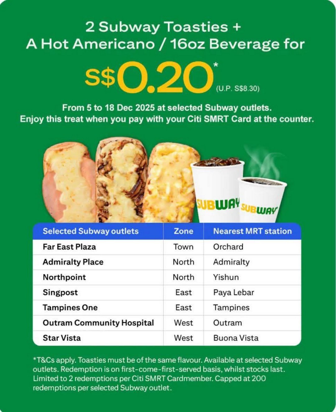Now, before you rush out the door, here’s the catch — and thankfully, it’s a simple one. To redeem this offer, customers need to pay using a Citi SMRT Card at the counter. It’s an easy step for cardholders, and with the price being so ridiculously low, it’s bound to attract a lot of attention. Subway has also made it clear that this offer is only available at selected outlets across Singapore, so knowing which branches are participating will save you time and ensure you don’t miss out.