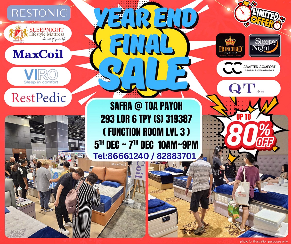 Every year, Singaporeans wait for the big year-end clearances, especially those who are planning to tidy up their home, refresh their furniture, or simply replace mattresses that have already lost their support. This December, the SAFRA Toa Payoh Year-End Final Sale is shaping up to be one of the strongest home-furnishing deals of the season. Running from 5th to 7th December, from 10 AM to 9 PM, this sale promises straightforward value, solid markdowns, and a surprisingly wide mix of big bedding brands — all under one roof at Function Room L1–3, SAFRA Toa Payoh, 293 Lor 6 Toa Payoh, S(319387).