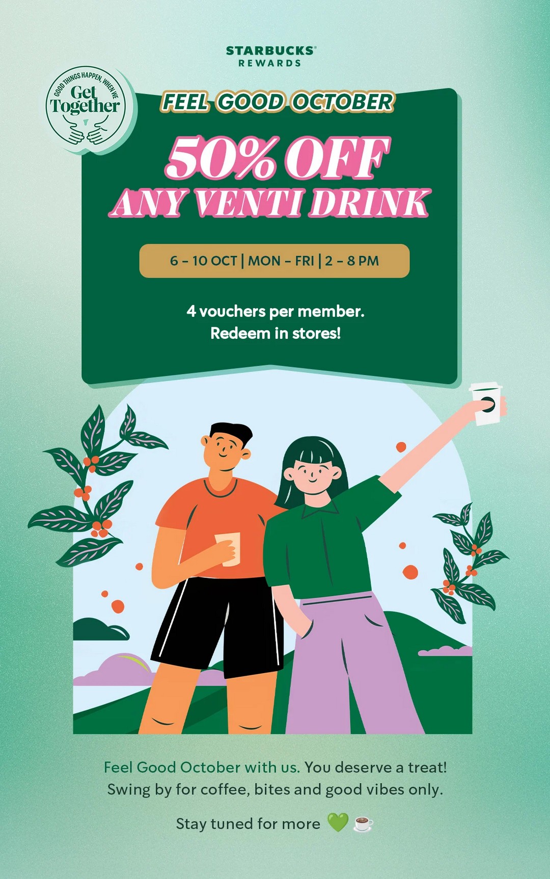 In summary, Starbucks’ Feel Good October 50% Off Any Venti Drink promotion is a compelling reason to visit a store, whether they are a seasoned coffee aficionado or just someone looking to enjoy a treat. The combination of value, quality, and choice makes it a stand-out promotion. It’s not just about saving money – it’s about enhancing the coffee experience, trying new flavours, and enjoying the community atmosphere that Starbucks offers. For those in Singapore, this five-day promotion is an ideal excuse to indulge in larger beverages, explore customisations, and enjoy time with friends or colleagues in a cosy setting. Don’t miss this chance to make their October mornings, afternoons, and evenings just a little sweeter and a lot more enjoyable.