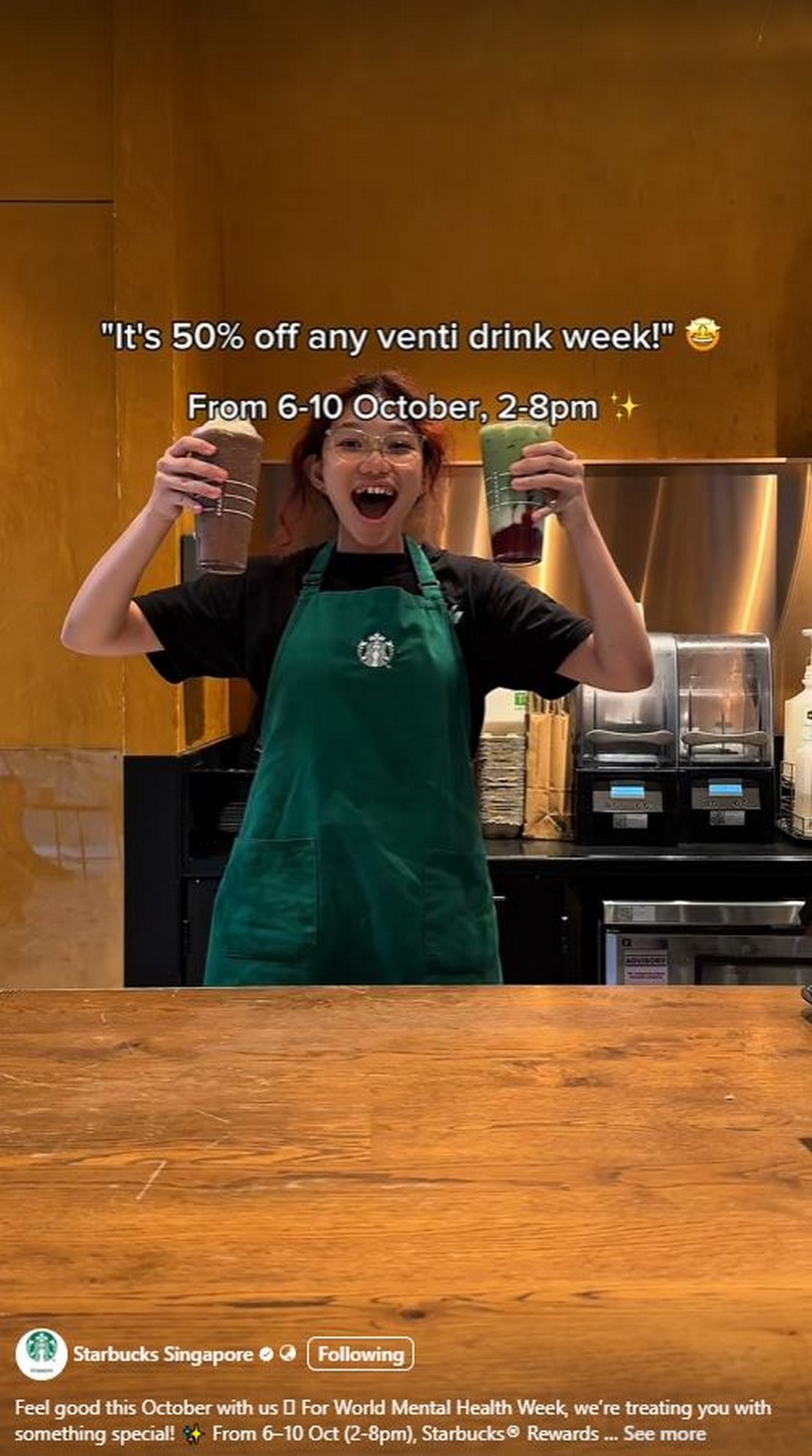To redeem this offer, simply visit any participating Starbucks Singapore store between 6–10 October 2025, from 2PM to 8PM, and pay using your registered Starbucks® Rewards account. The 50% discount will automatically apply to any Venti-sized beverage.