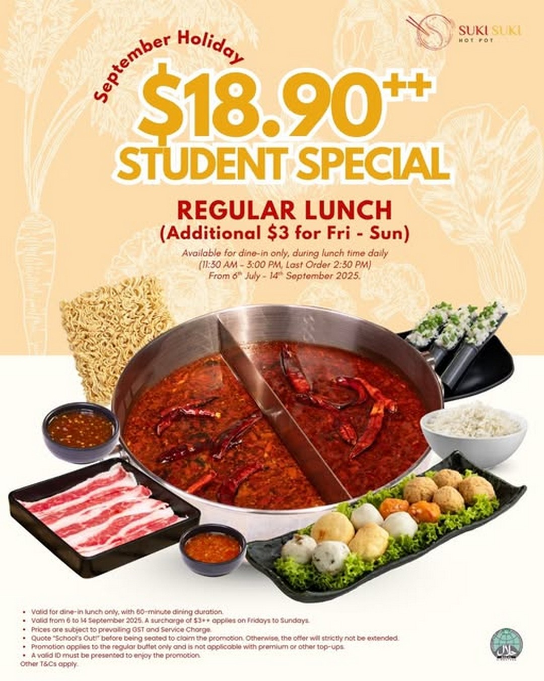 If students in Singapore are on the lookout for a wallet-friendly yet satisfying lunch option, Suki-Suki Hot Pot is making it exceptionally easy this September. From 6–14 September 2025, they can enjoy a Regular Lunch Buffet for only $18.90++ – a deal that’s hard to resist for anyone craving hot pot without burning a hole in their pocket.