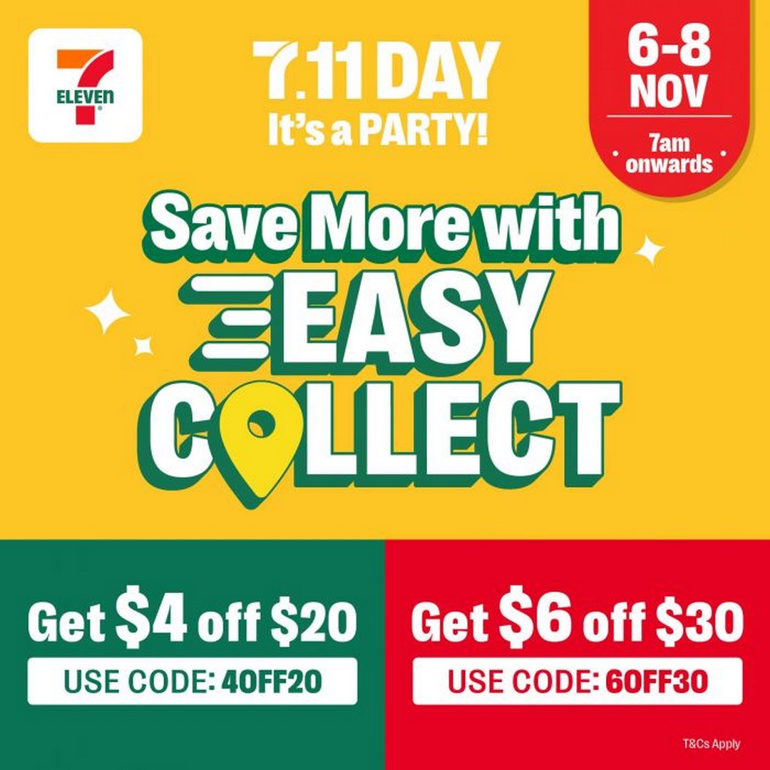 The promotion is valid at participating 7-Eleven outlets in Singapore from 6 to 8 November 2025, starting from 7am daily. Customers must use the 7-Eleven app and redeem via EasyCollect to qualify for the discount. Standard terms and conditions apply, which can be viewed directly within the app.