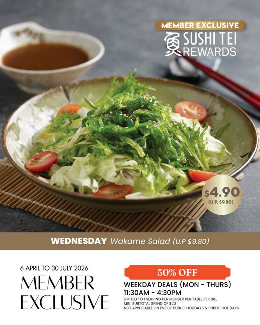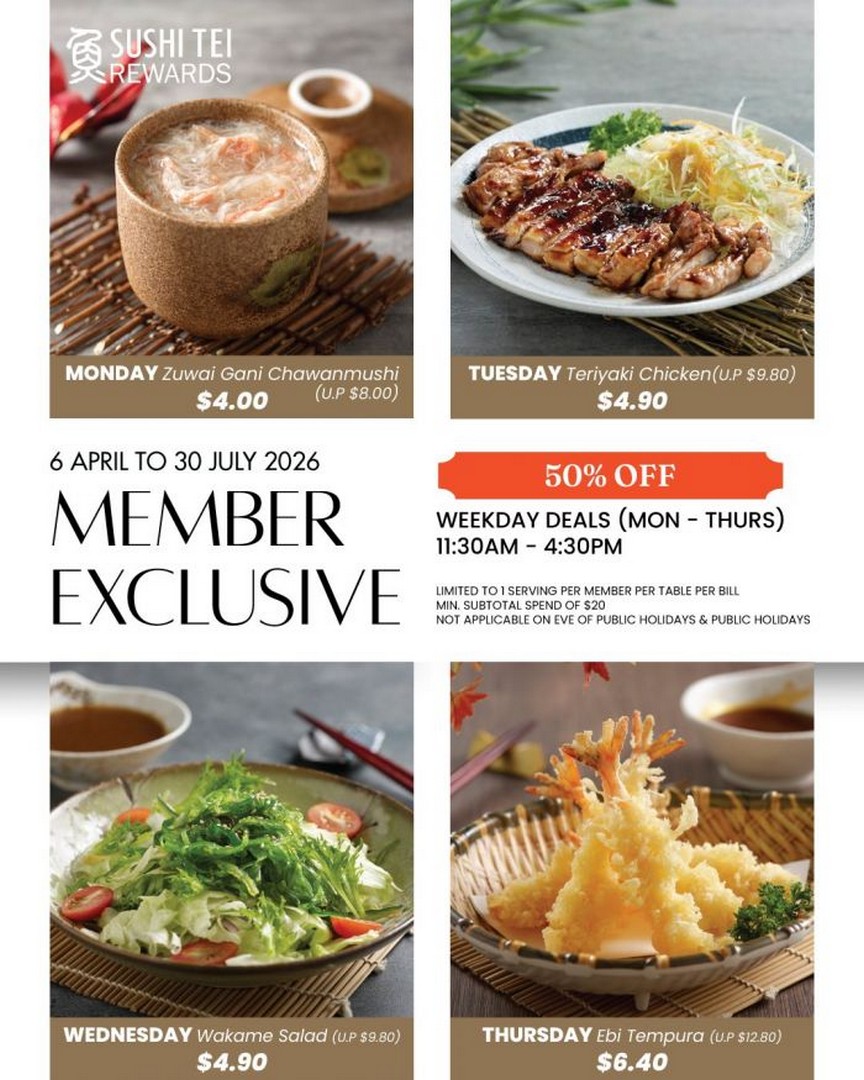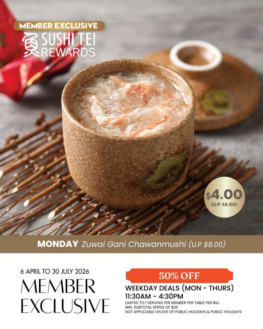 From 6 April to 30 July 2026, Sushi Tei Singapore is rolling out an exclusive 50% OFF Weekday Specials Promotion, available only to their Rewards Members. Designed with both value and variety in mind, this campaign transforms ordinary weekday lunches into something far more exciting. Rather than offering blanket discounts, Sushi Tei has carefully curated a rotating lineup of signature dishes, each featured on a specific weekday at half price.