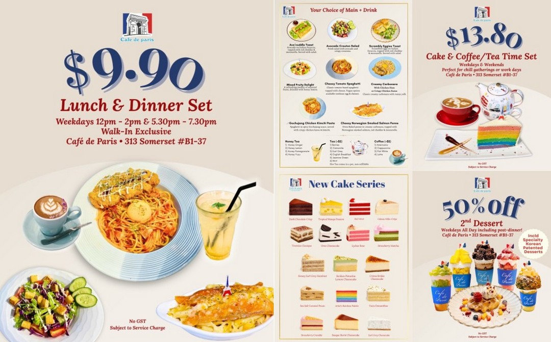 So whether you’re craving a proper lunch, a sweet afternoon pick-me-up, or a post-work dessert, make a note of Café de Paris’ weekday deals. With main courses, drinks, cakes, coffee, tea, and discounted desserts all within easy reach, it’s a rare chance to enjoy Parisian-inspired dining at a price that makes sense. Walk in, pick your favourite set, and let yourself enjoy a little indulgence—you deserve it.
